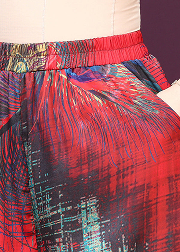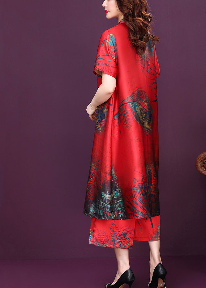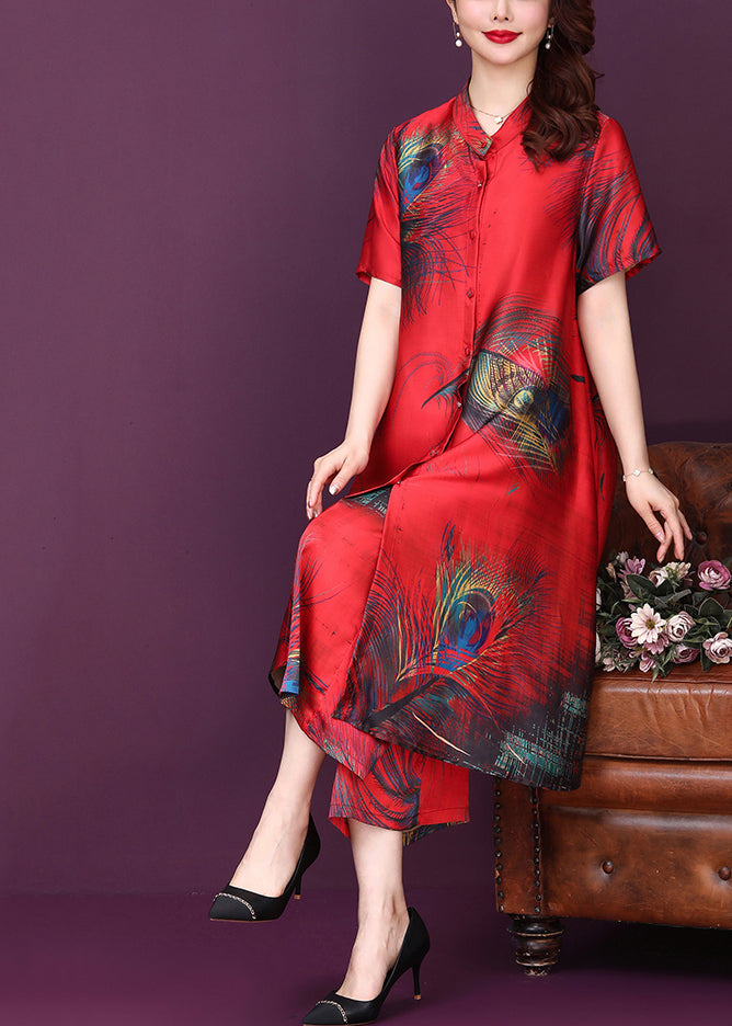 Original Design Red Stand Collar Print Silk Shirt Top And Pants Two Pieces Set Summer