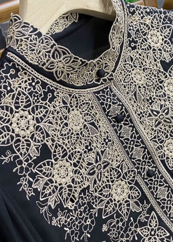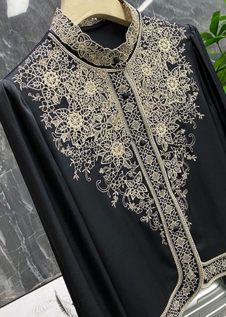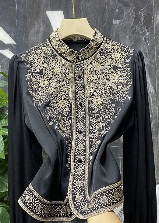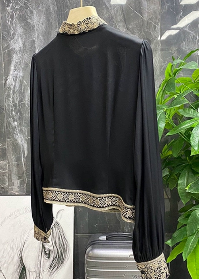 Plus Size Black Button Stand Collar Embroidered Silk Shirt Long Sleeve