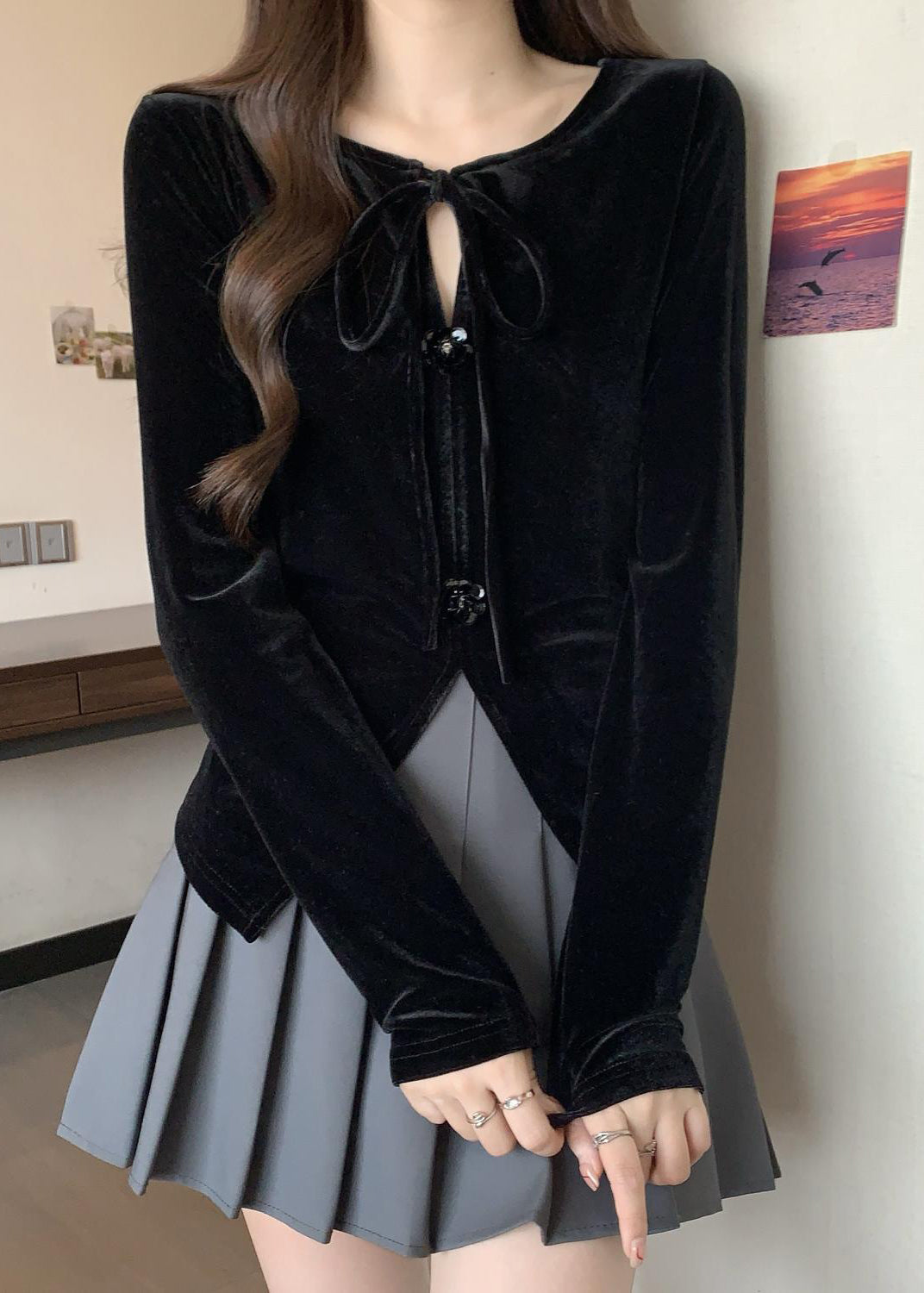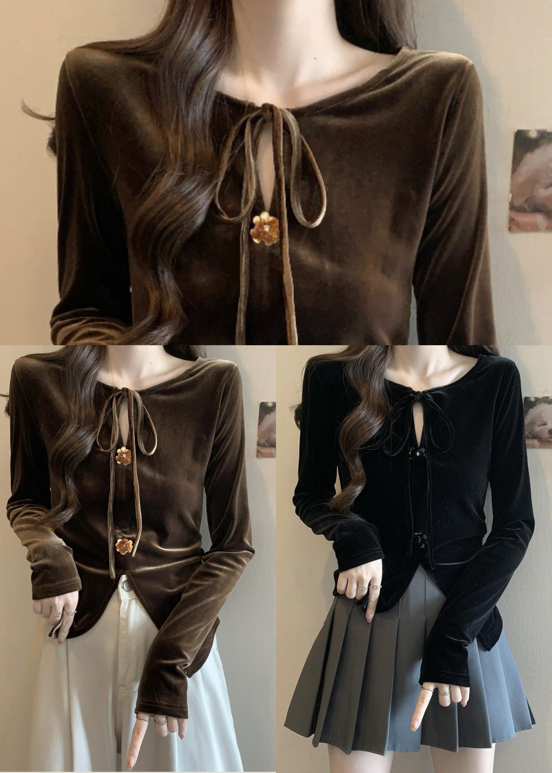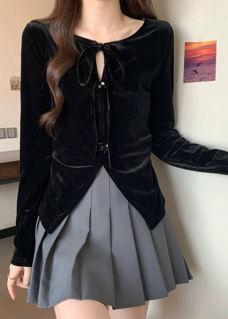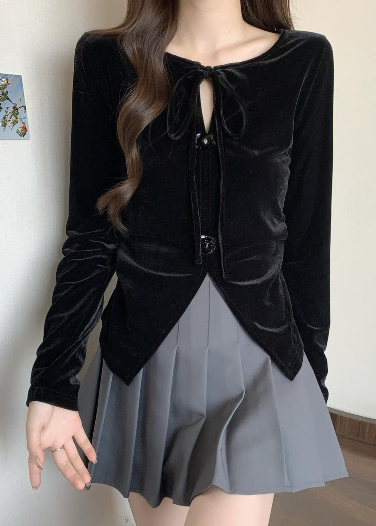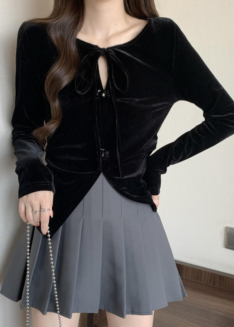 Plus Size Black Side Open Flower Decorated Silk Velour Shirts Fall