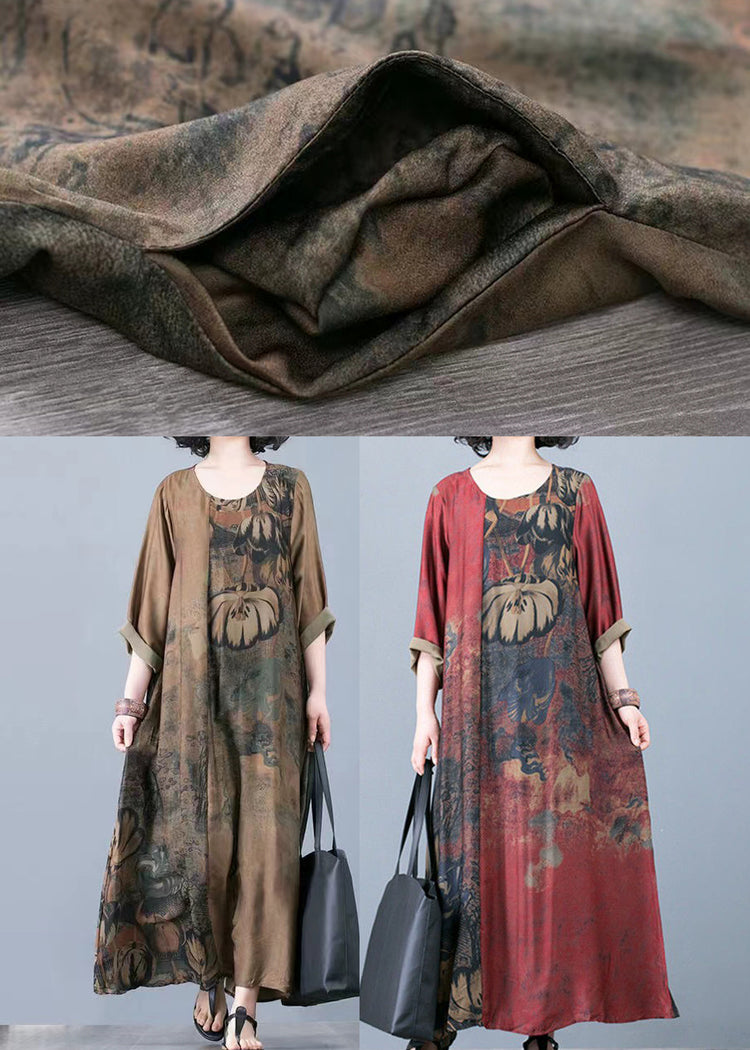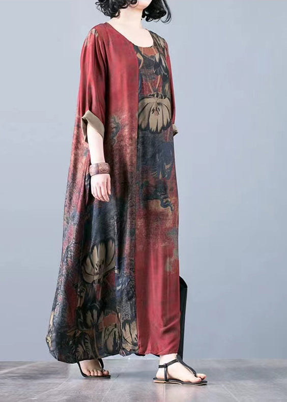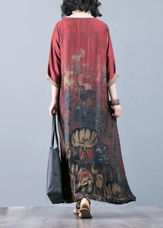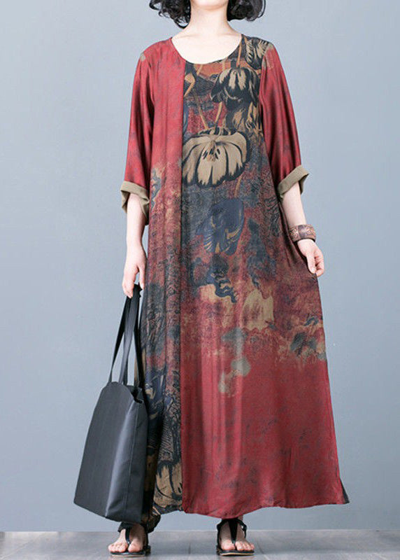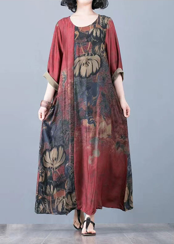 Plus Size Red O-Neck Print Silk Ankle Dresses Three Quarter sleeve