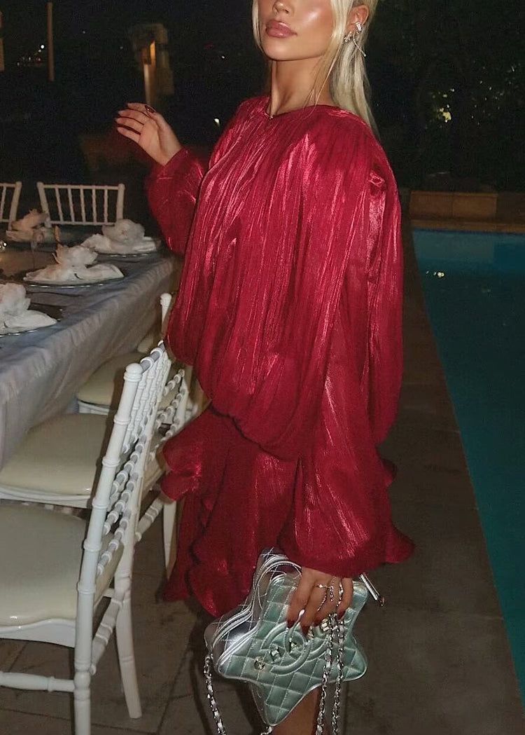 Red Lace Up Dress And Shorts Silk Two Pieces Set Wrinkled