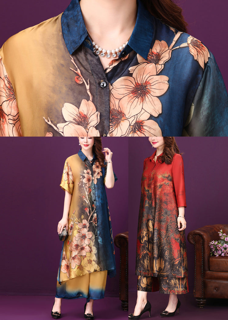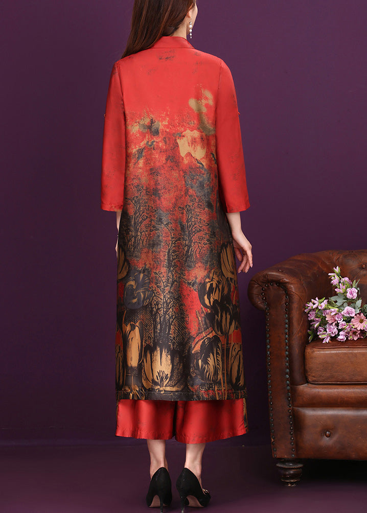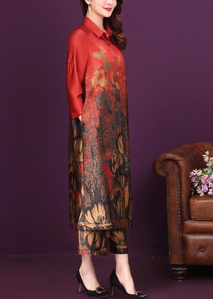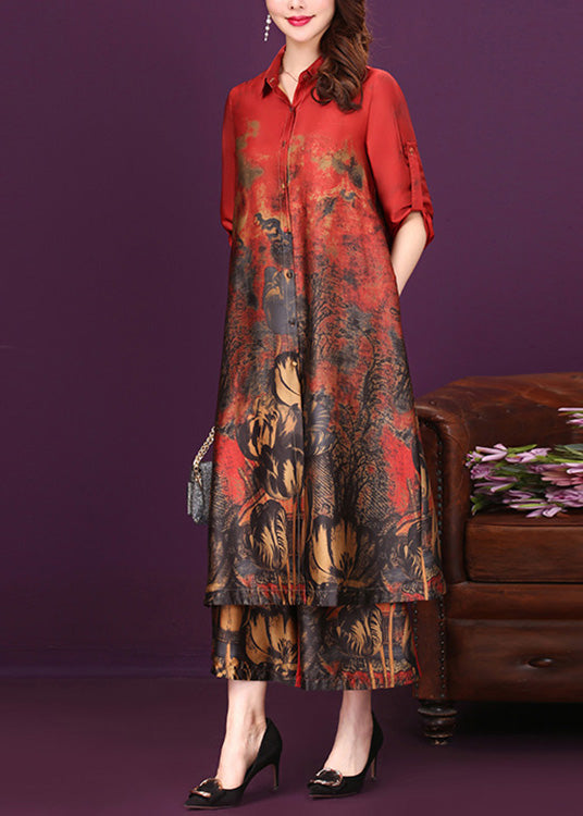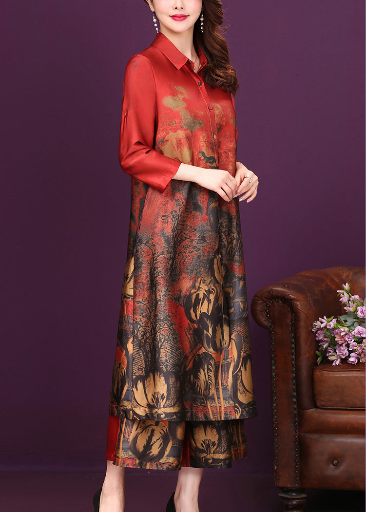 Red Peter Pan Collar Silk Long Shirts And Wide Leg Pants Two Piece Set Summer