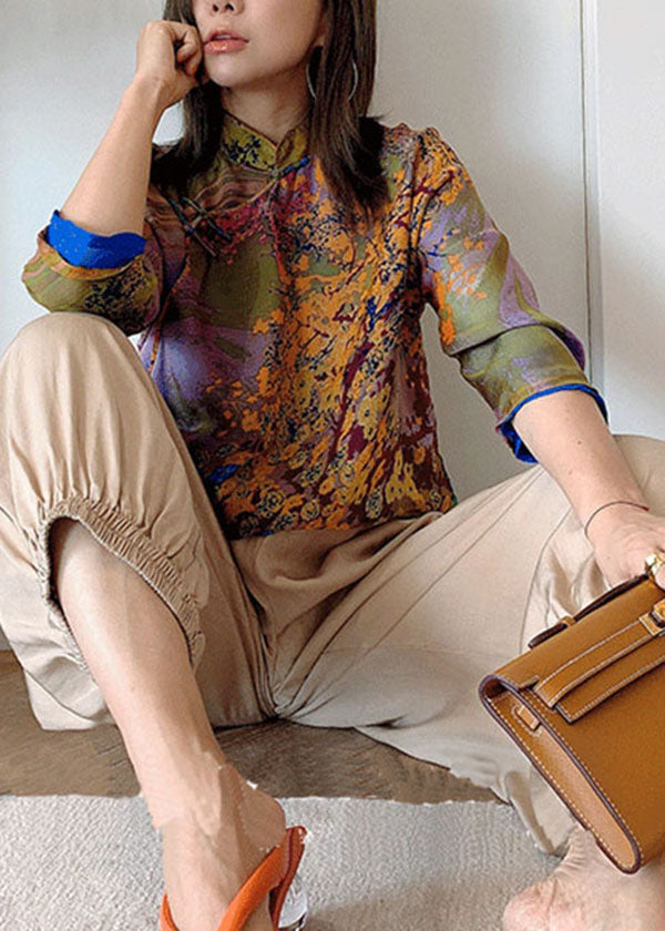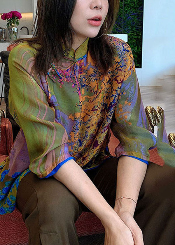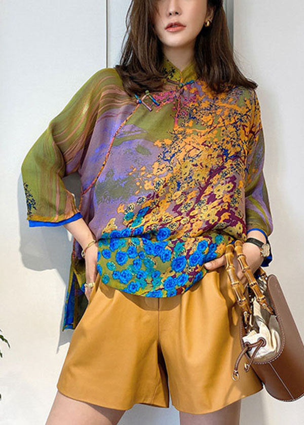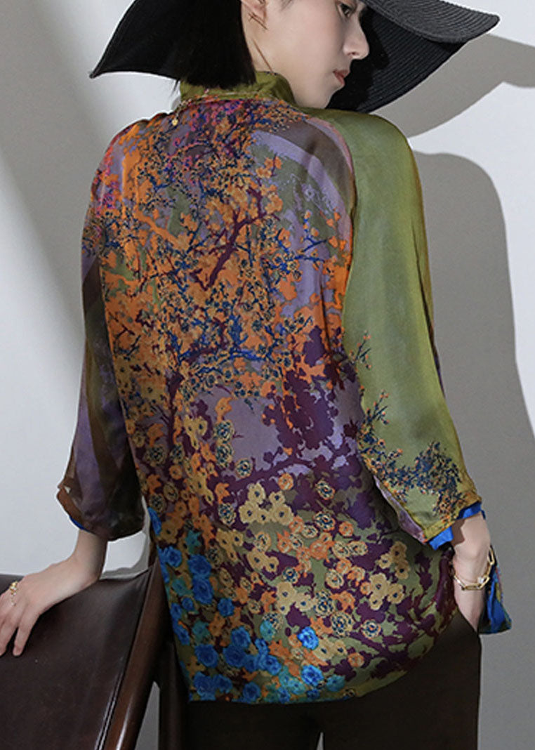 Retro Green Mandarin Collar Print Side Open Silk Oriental Shirts Bracelet Sleeve