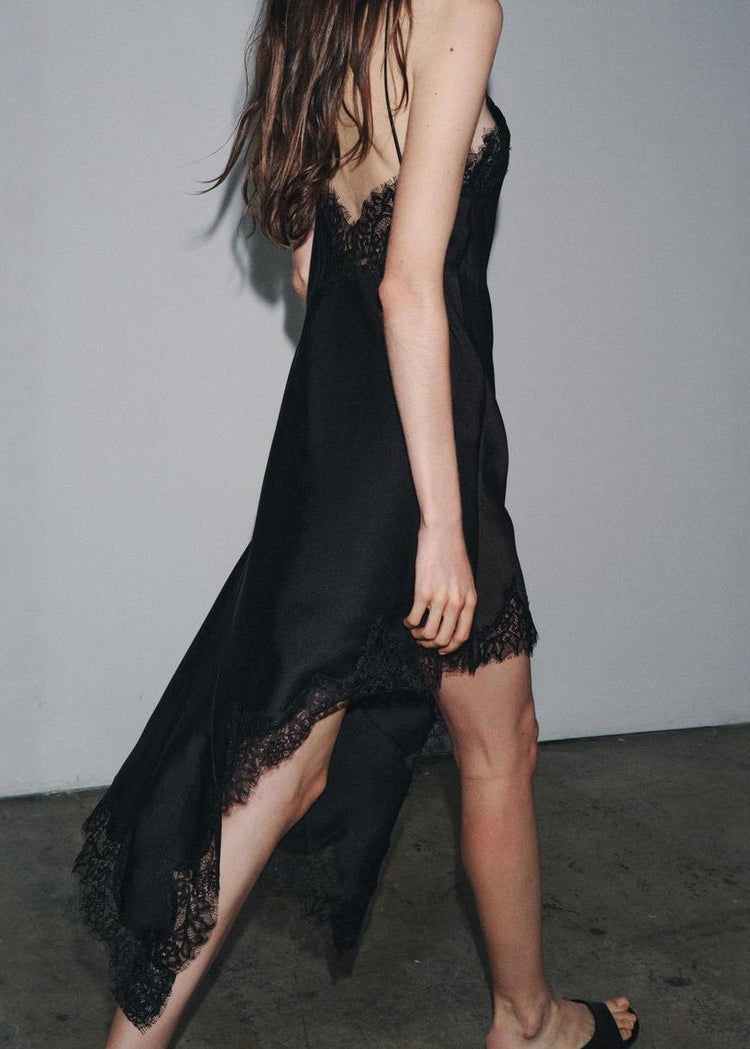 Sexy Black Asymmetrical Lace Patchwork Silk Dresses Sleeveless