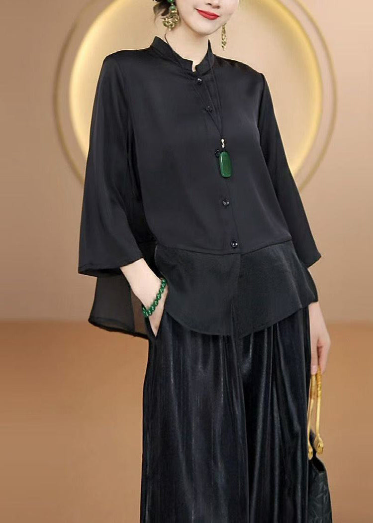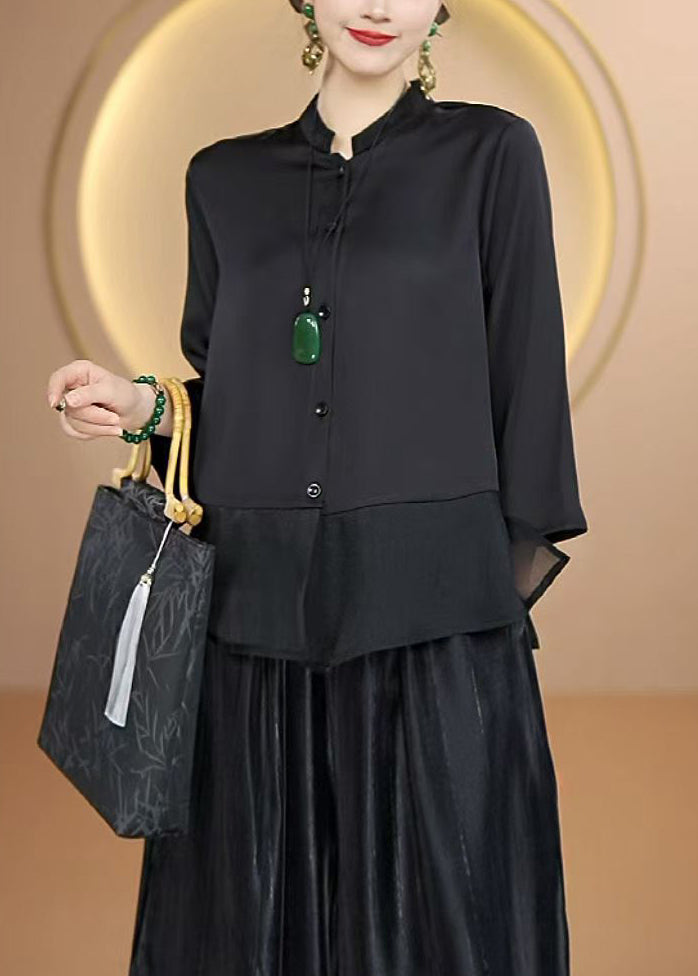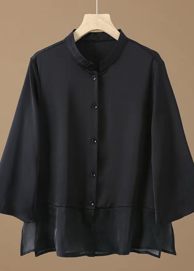 Simple Black Stand Collar Button Patchwork Silk Tops Fall