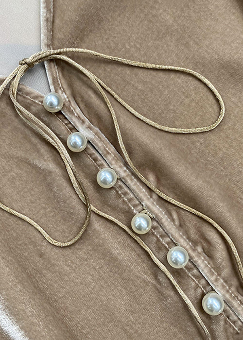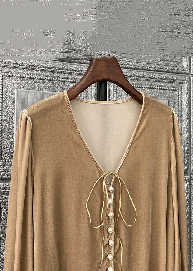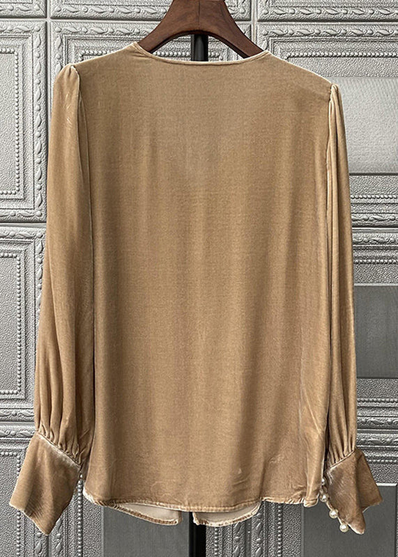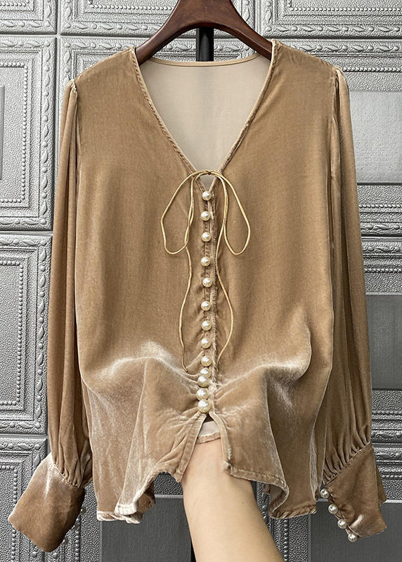 Simple Brown V Neck Pearl Patchwork Silk Velour Top Long Sleeve