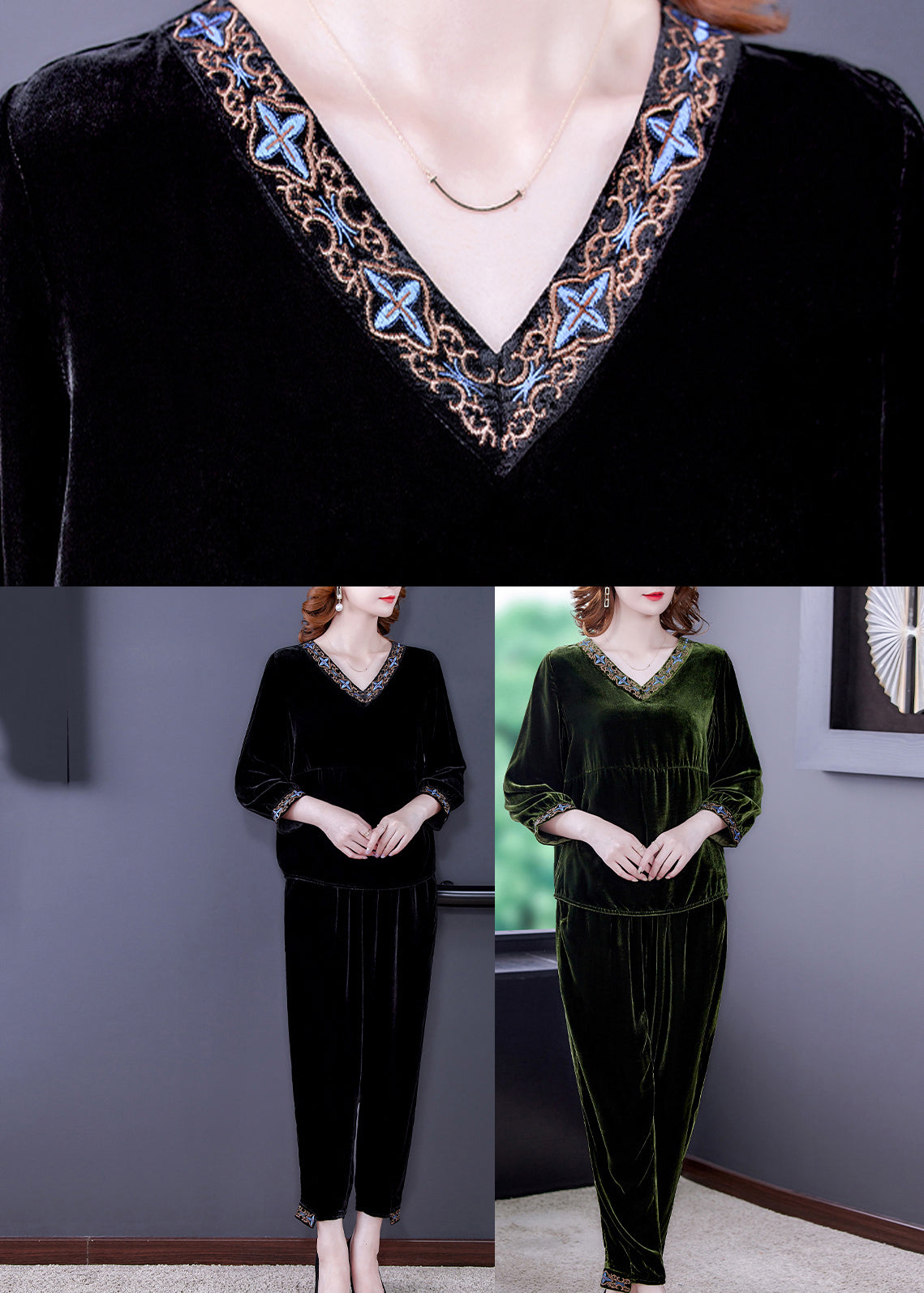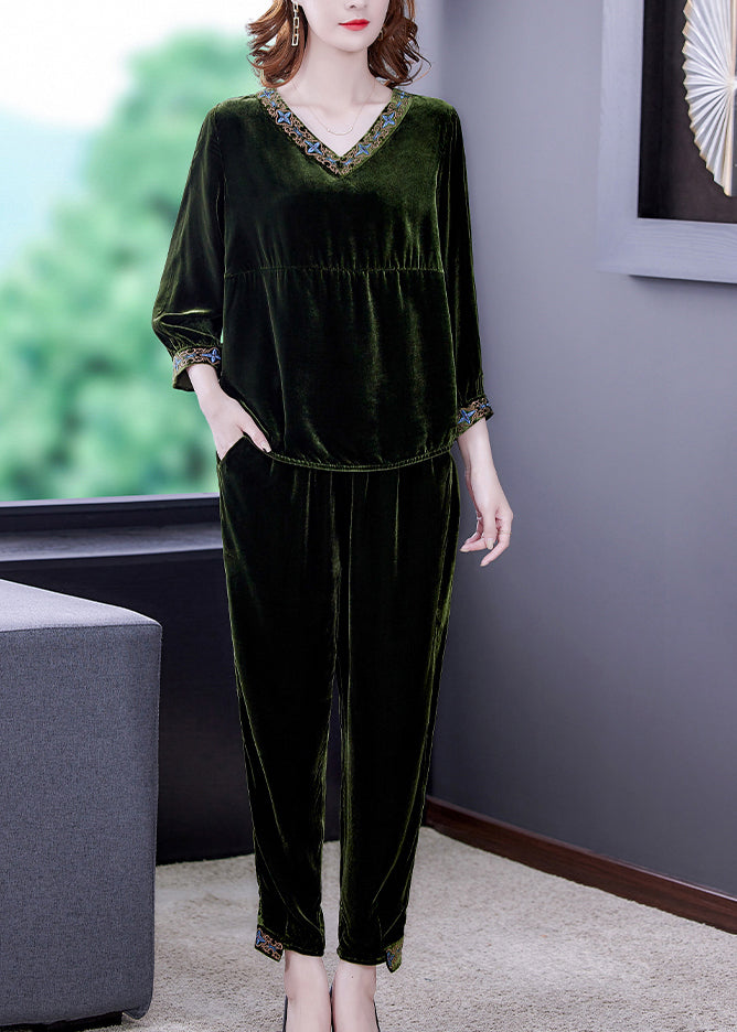 Simple Green Patchwork Silk Velour Pullover And Harem Pants Two Piece Set Fall