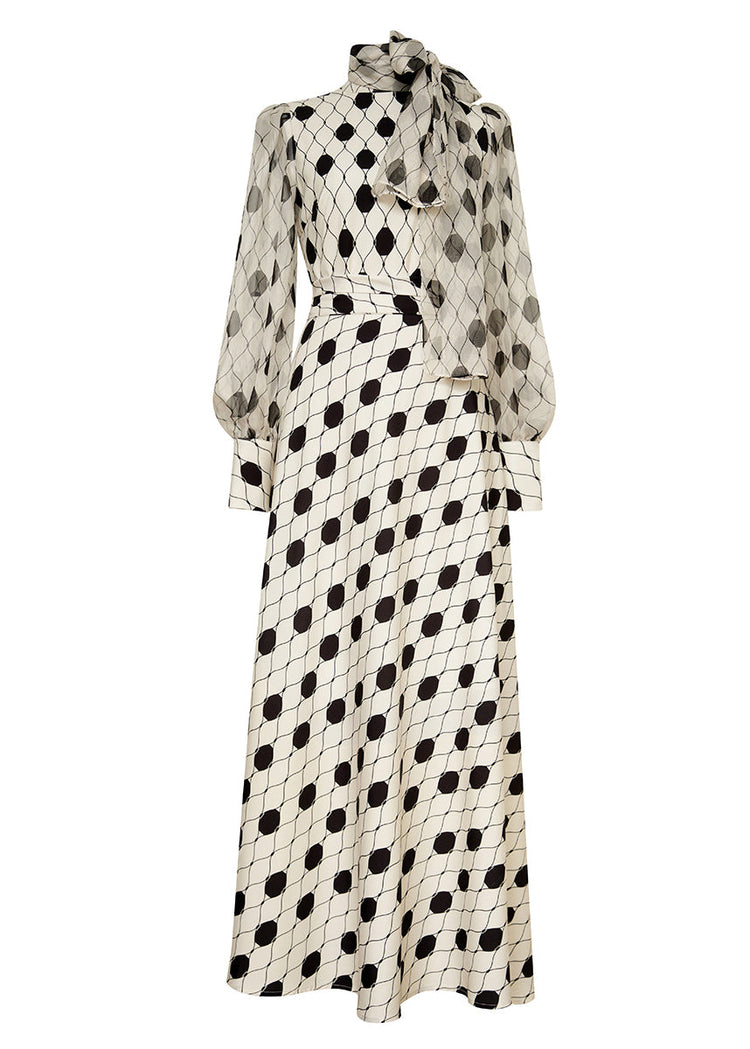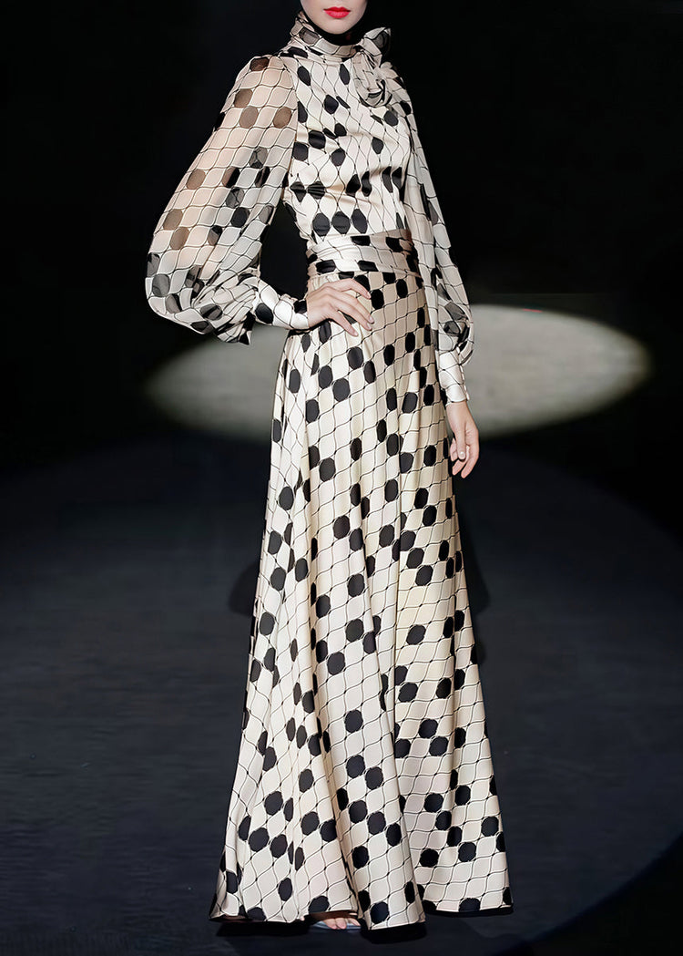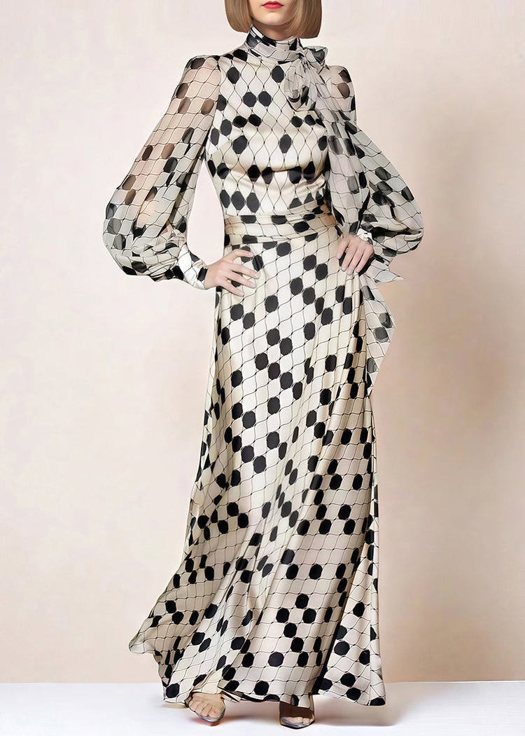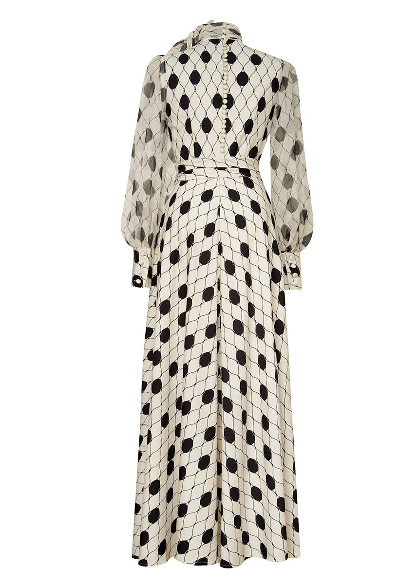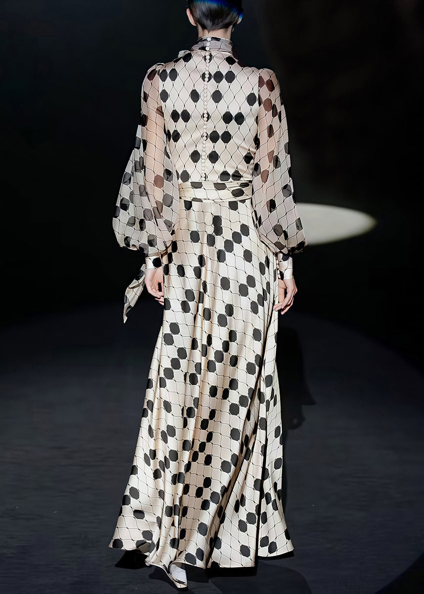 Slim Fit Lace Up Dot Silk Long Dress Lantern Sleeve