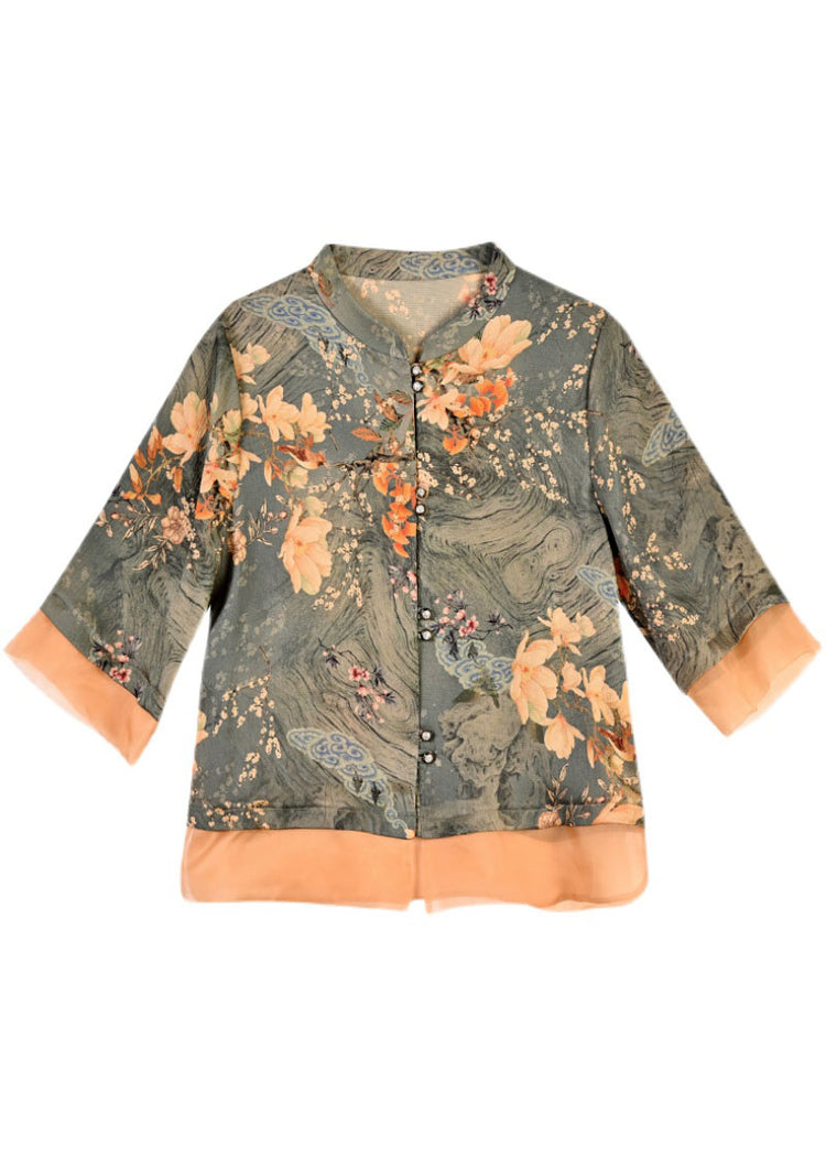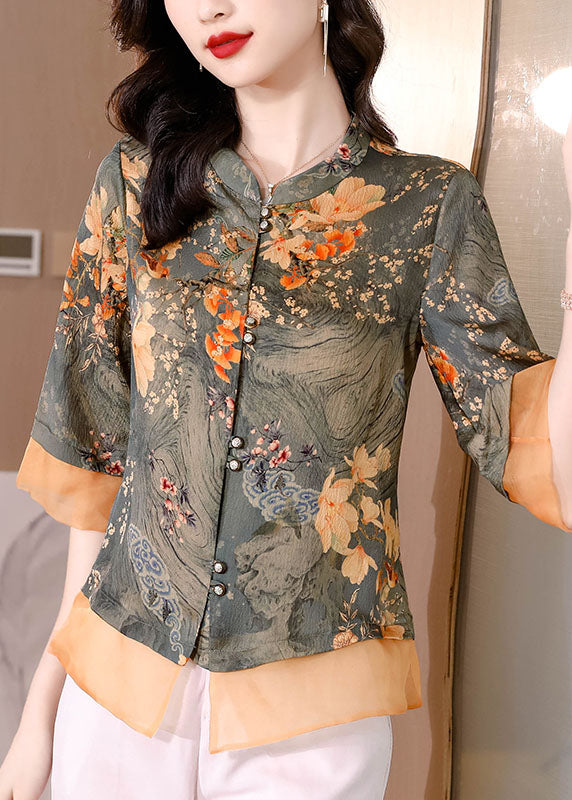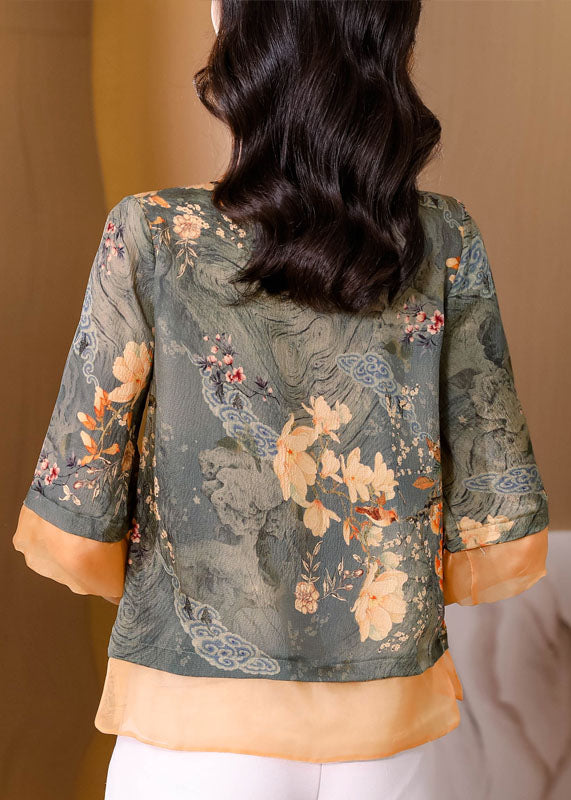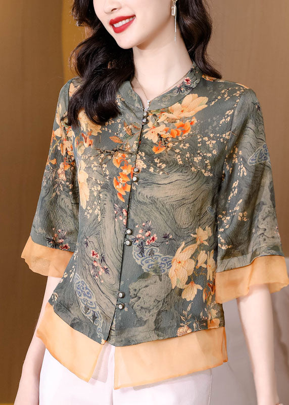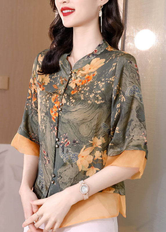 Slim Fit Light Green O-Neck Print Button Tulle Patchwork Silk Blouse Tops Short Sleeve