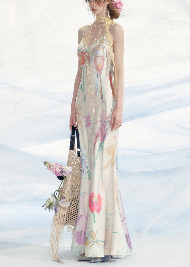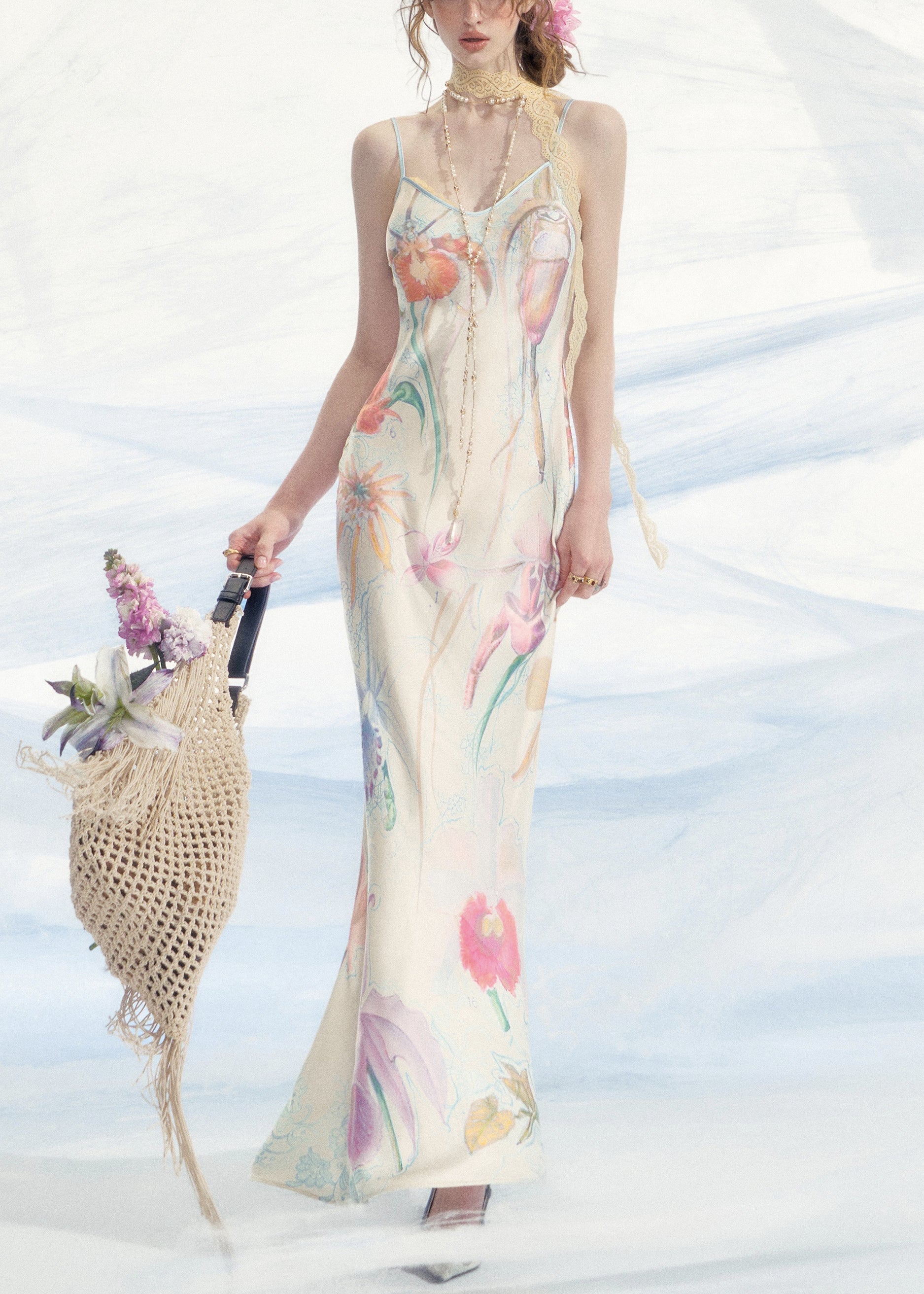 Slim Fit White V Neck Print Silk Spaghetti Strap Dress Sleeveless