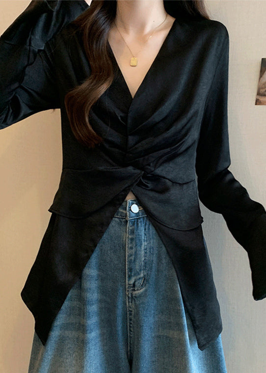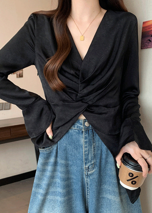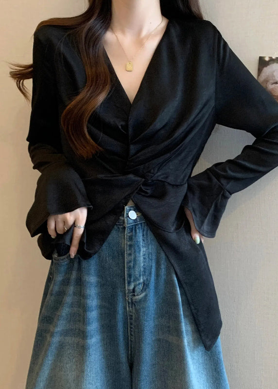 Style Black V Neck Wrinkled Silk Shirts Flare Sleeve