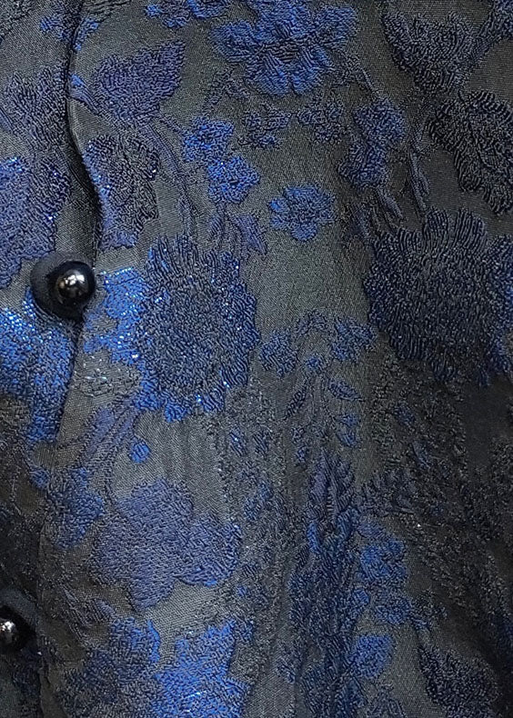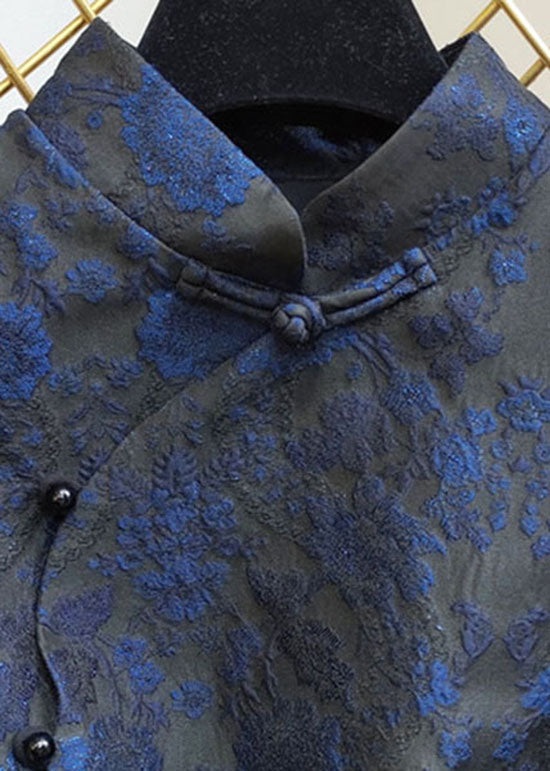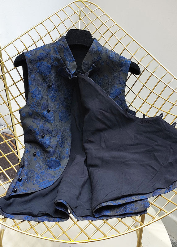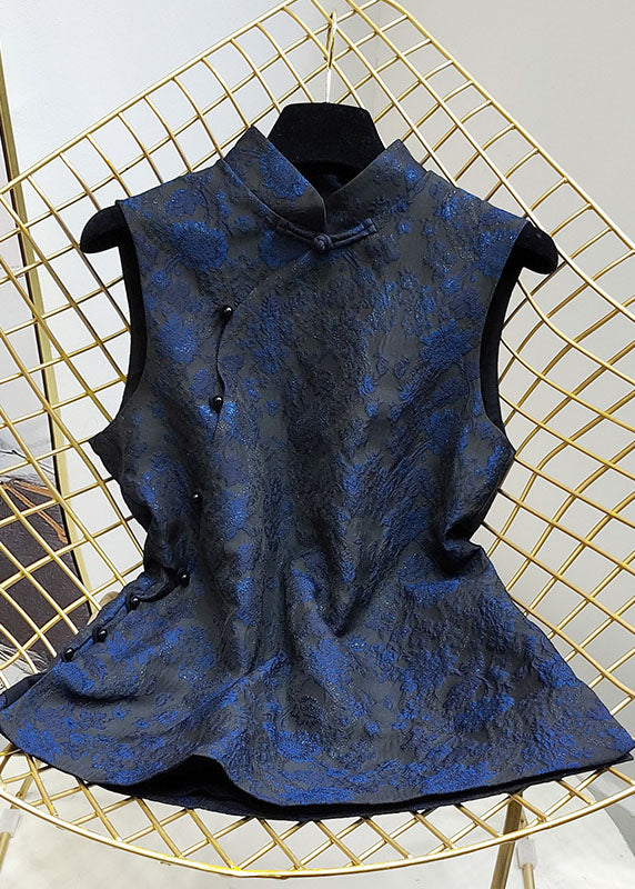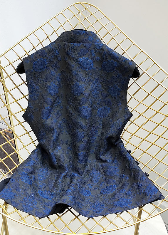 Stylish Blue Stand Collar Jacquard Slim Fit Silk Vest Sleeveless