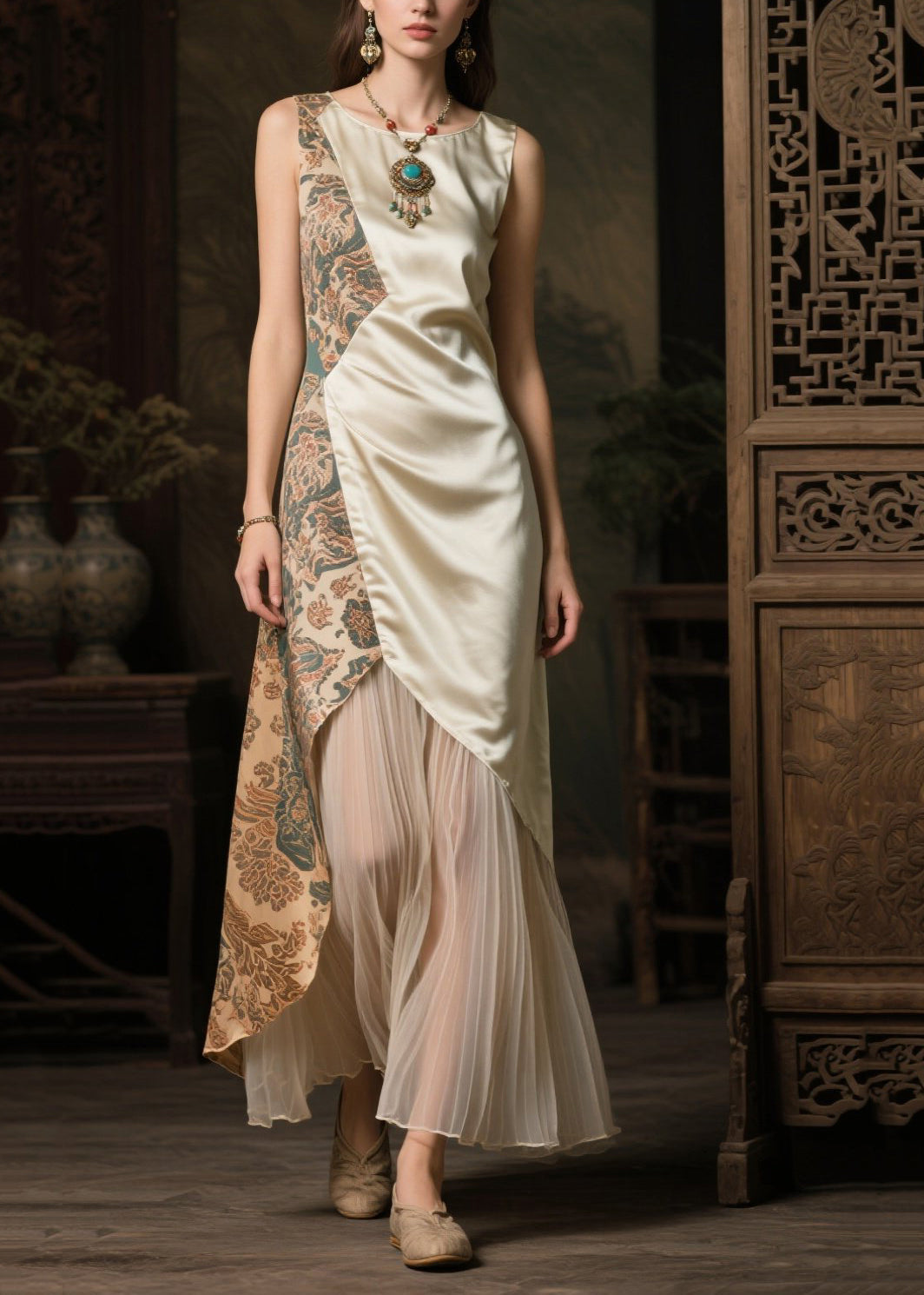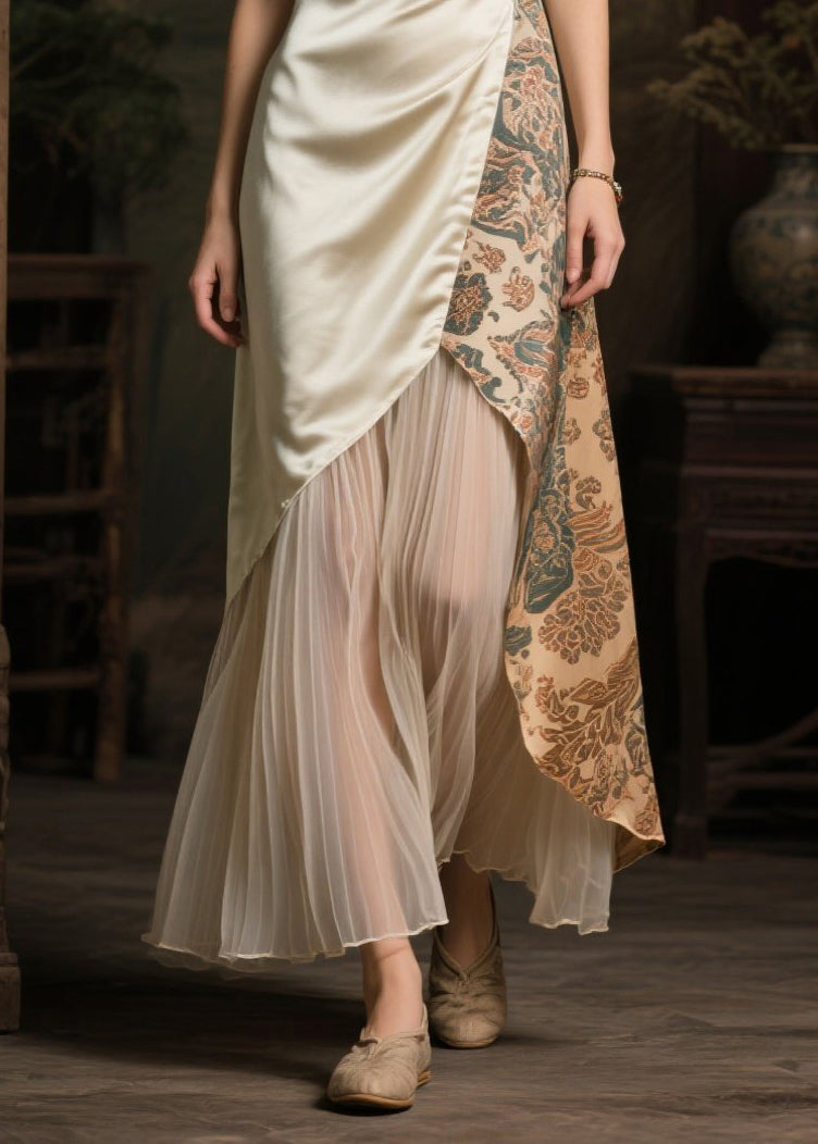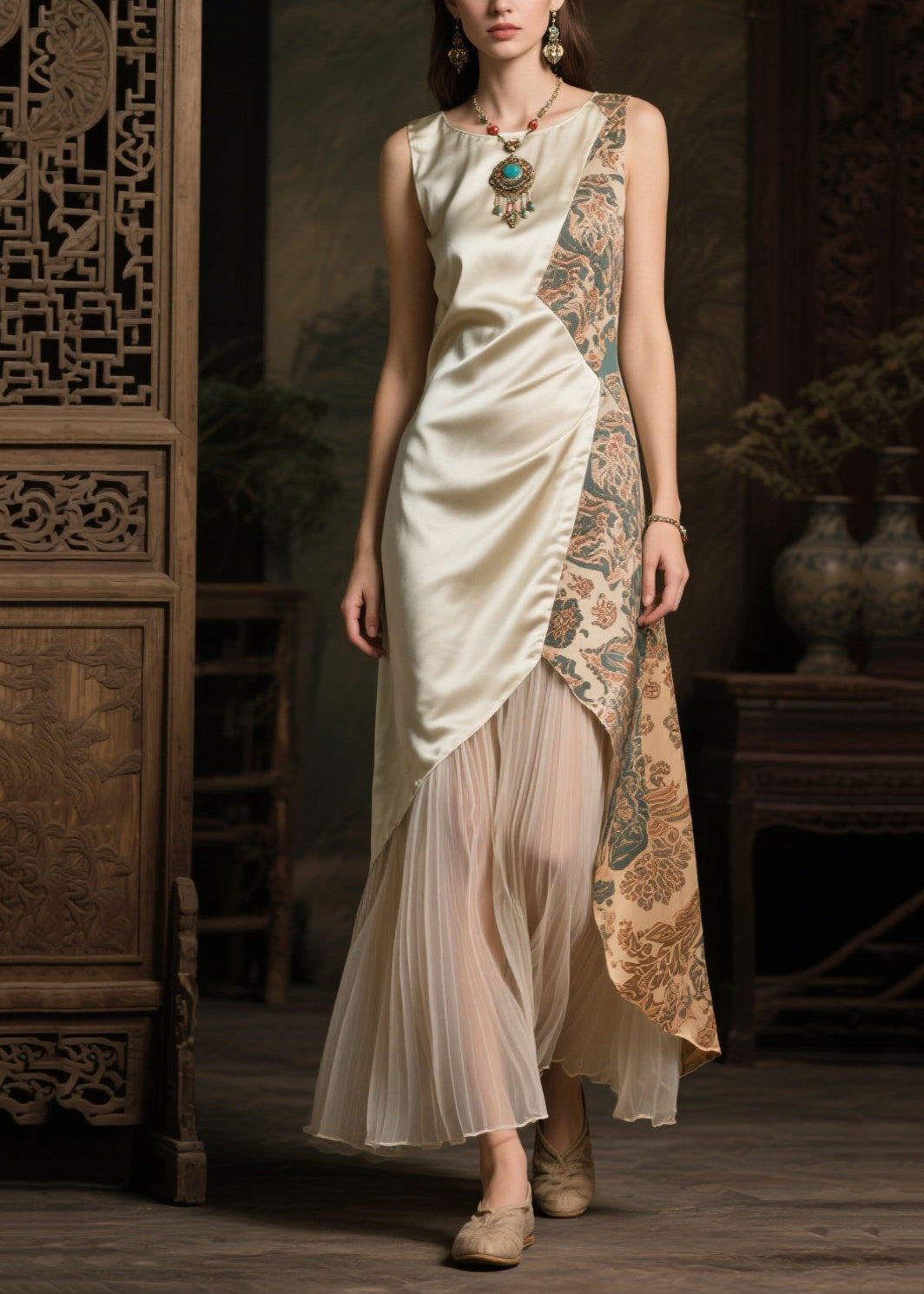 Stylish Champagne Asymmetrical Patchwork Tulle Silk Long Dress Sleeveless