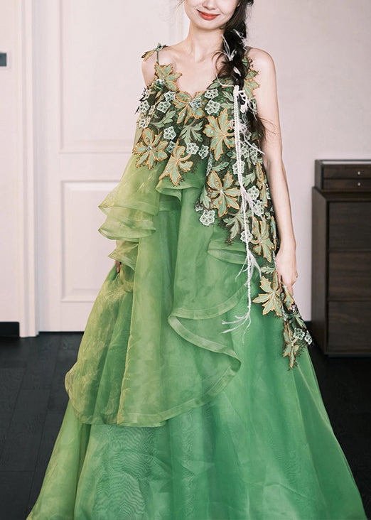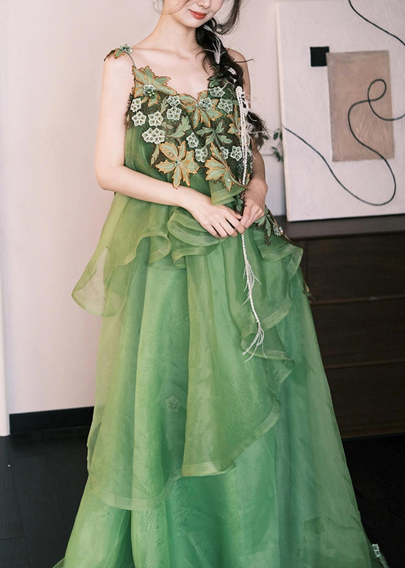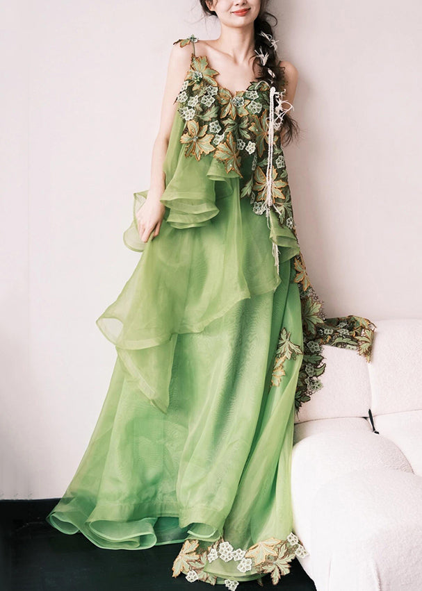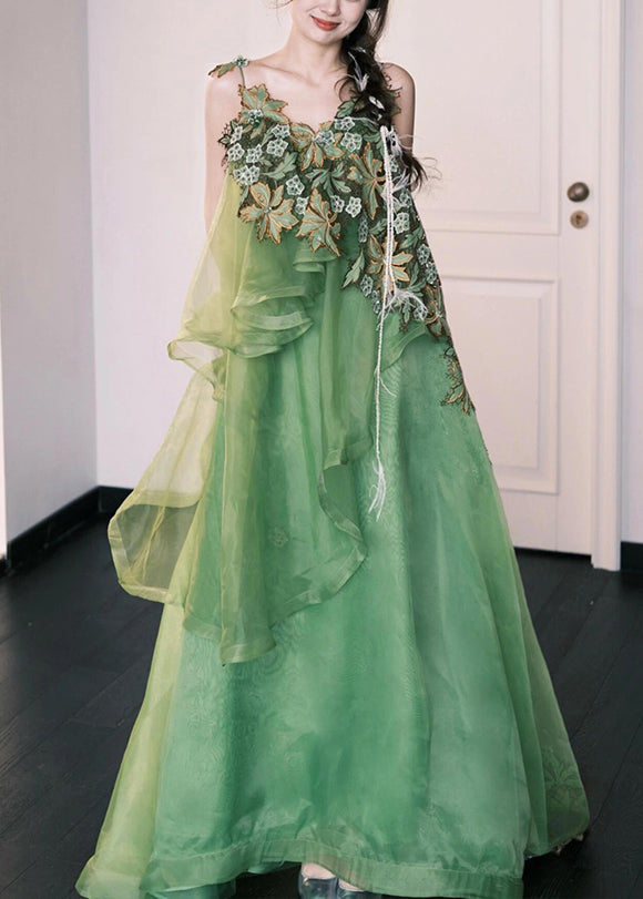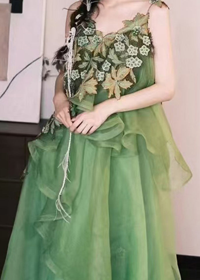 Stylish Green Embroidered Patchwork Silk Cotton Spaghetti Strap Dress Sleeveless