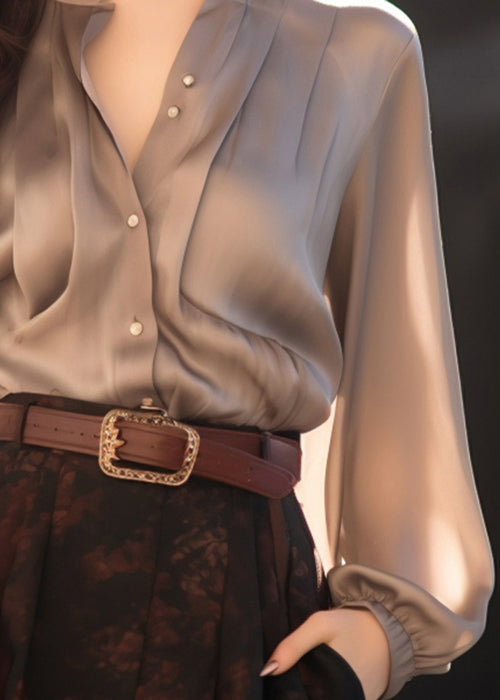 Stylish Grey Original Design Button Solid Silk Shirts Fall