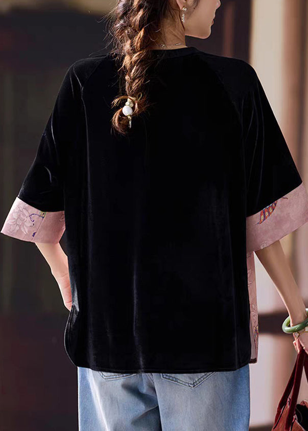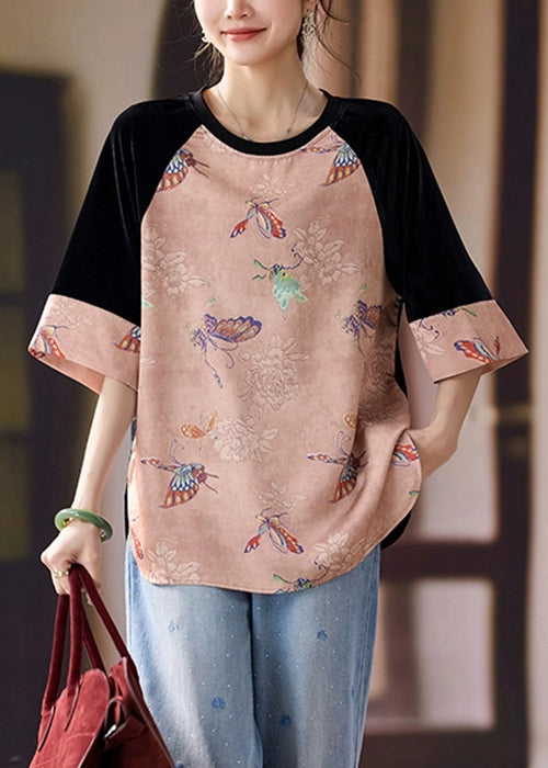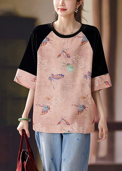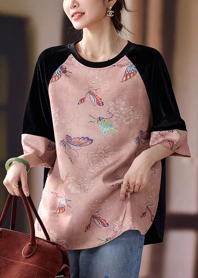 Stylish Pink Print Patchwork Silk Velour T Shirts Half Sleeve