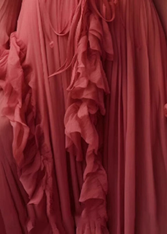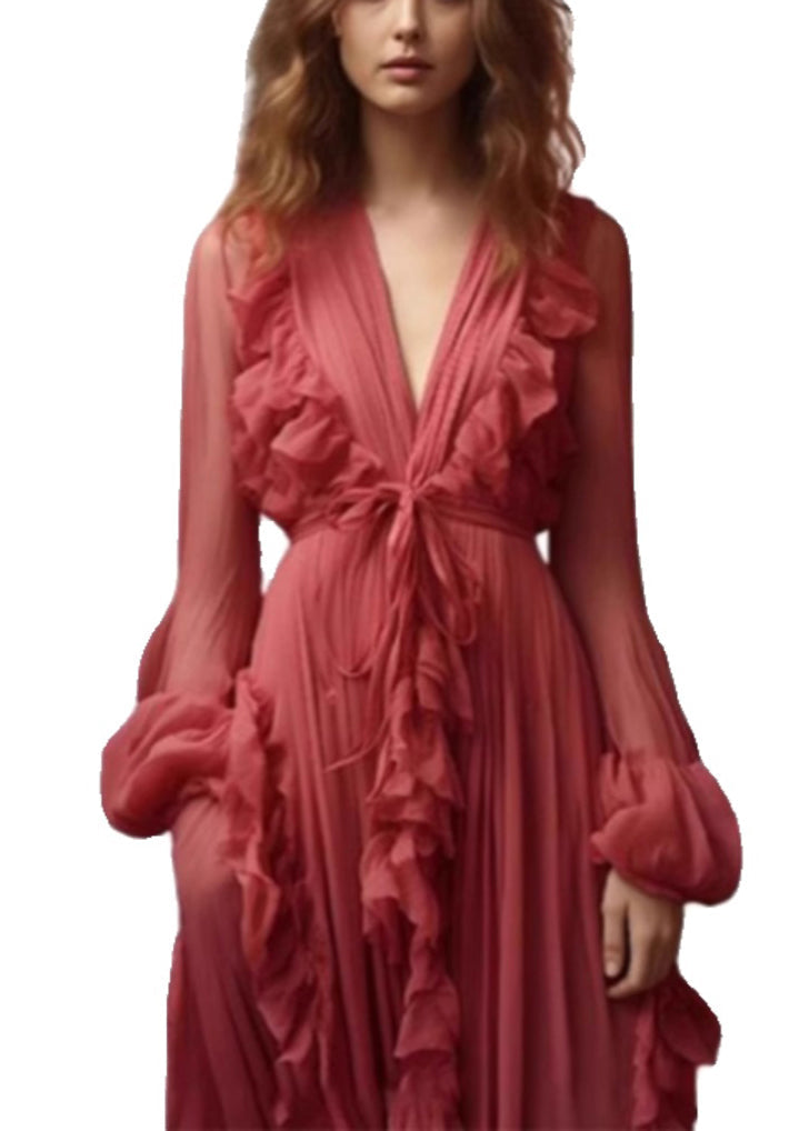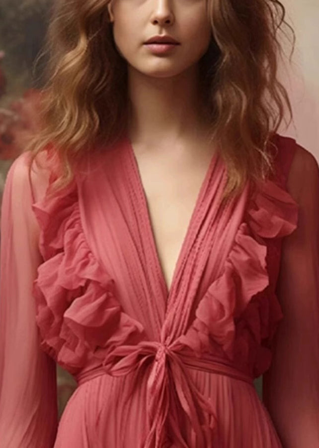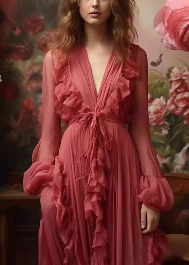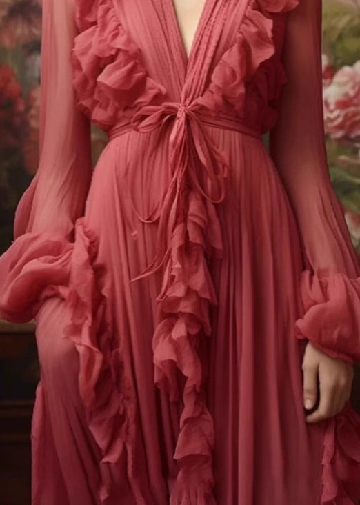 Stylish Red V Neck Ruffled Lace Up Silk Long Dresses Fall