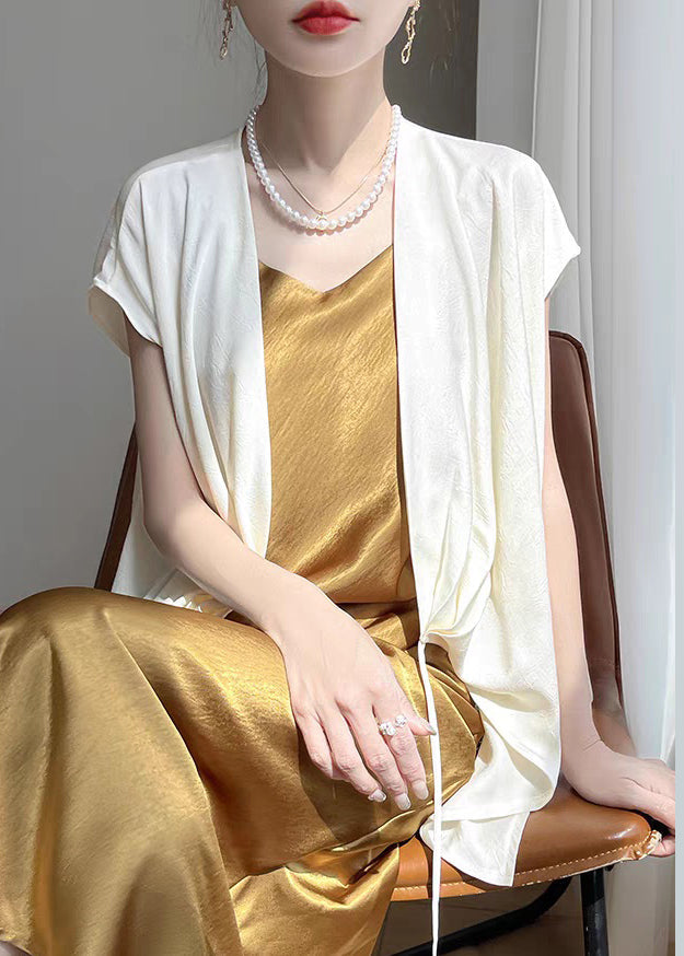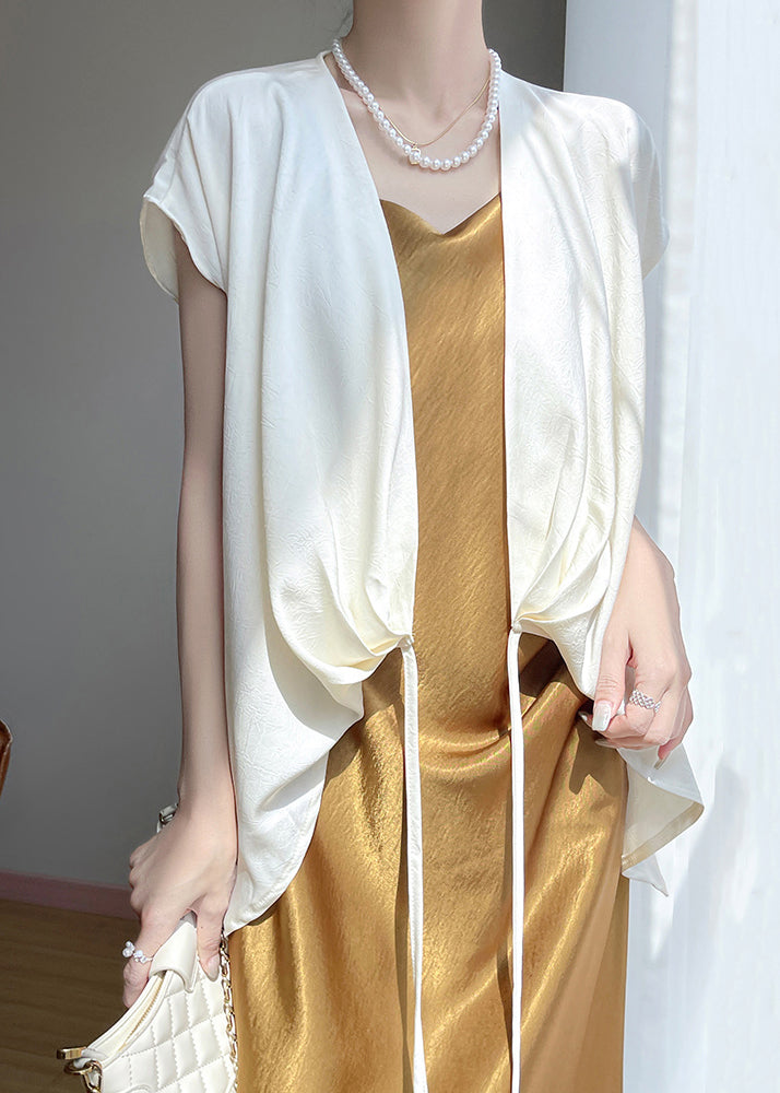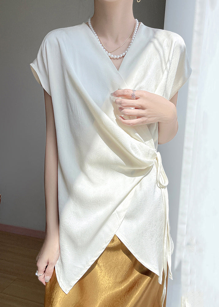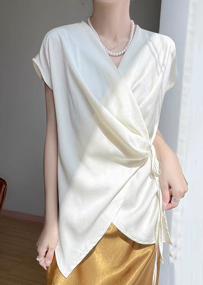 White Lace Up Solid Silk Blouse V Neck Short Sleeve