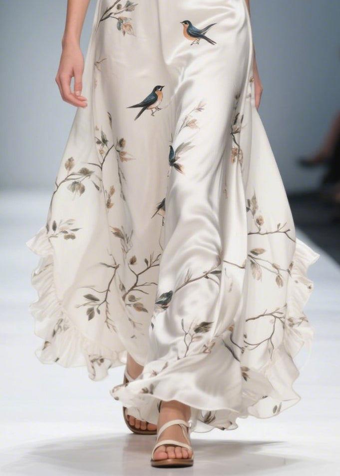 White Print Draping Silk Vacation Dresses Ruffled Summer