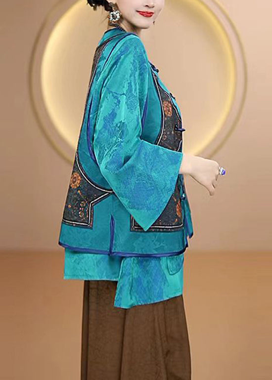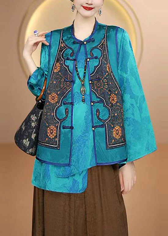 Women Blue O Neck Oriental Button Silk Vest Sleeveless