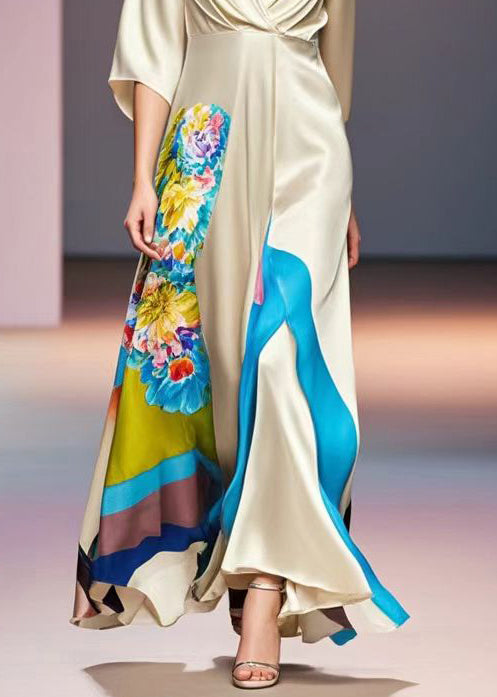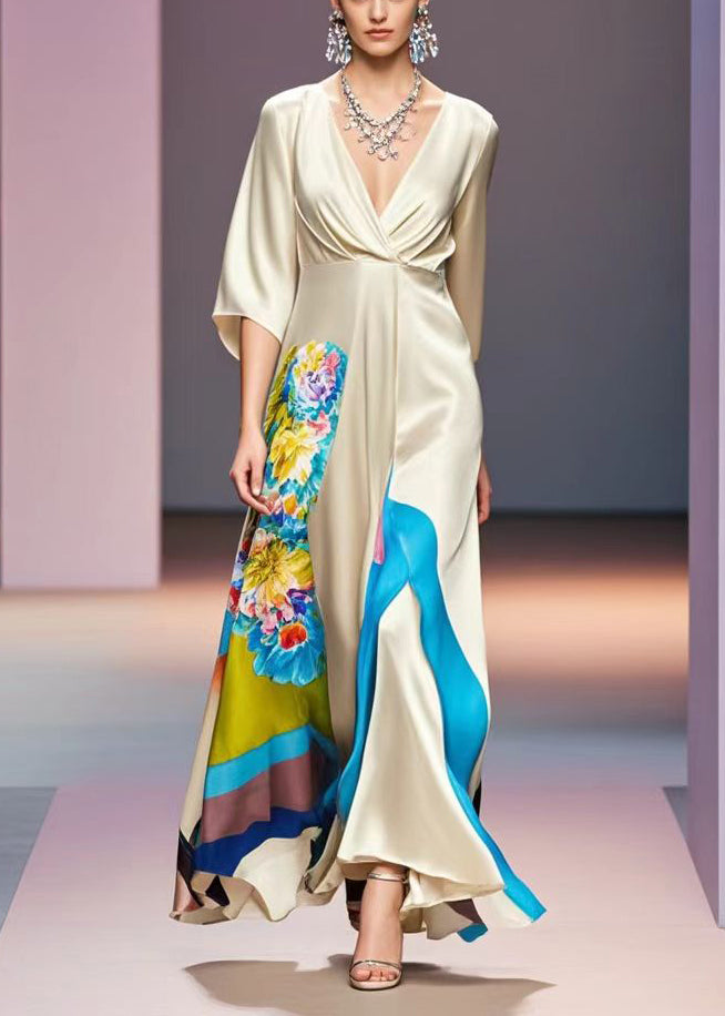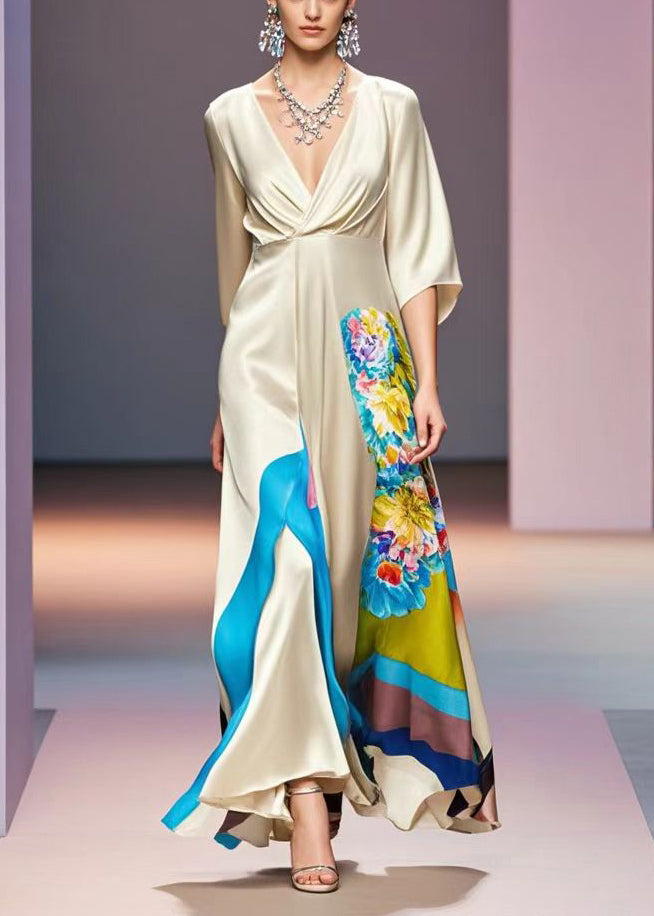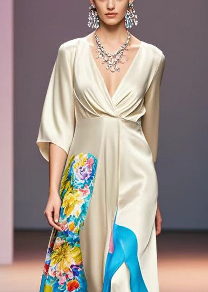 Women Champagne V Neck Print Silk Robe Dresses Bracelet Sleeve