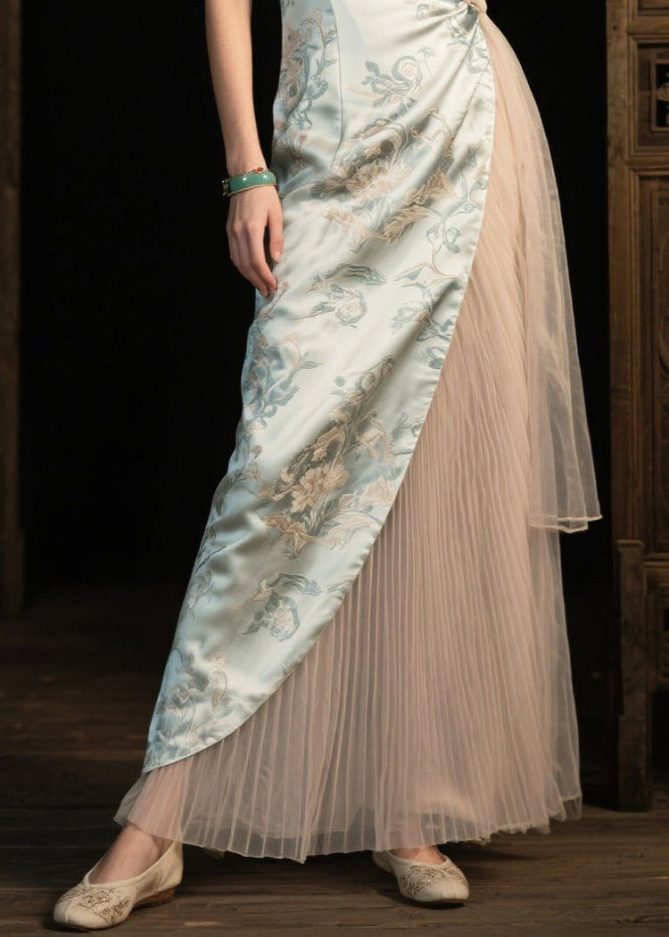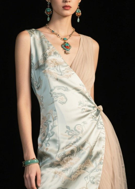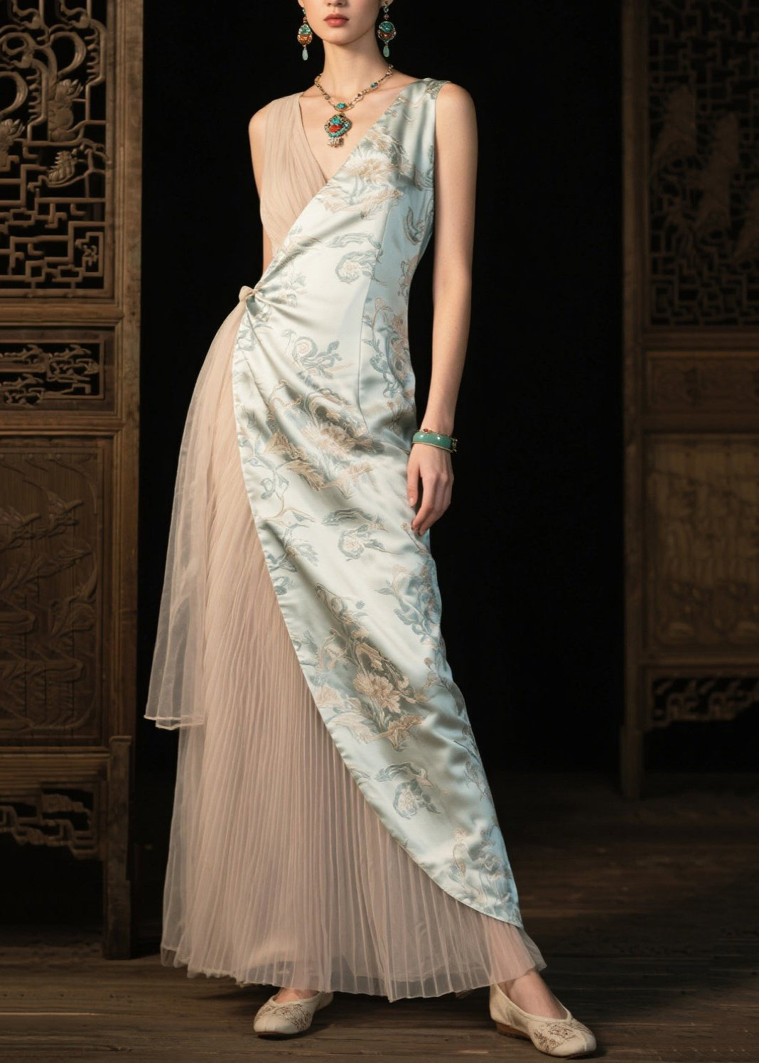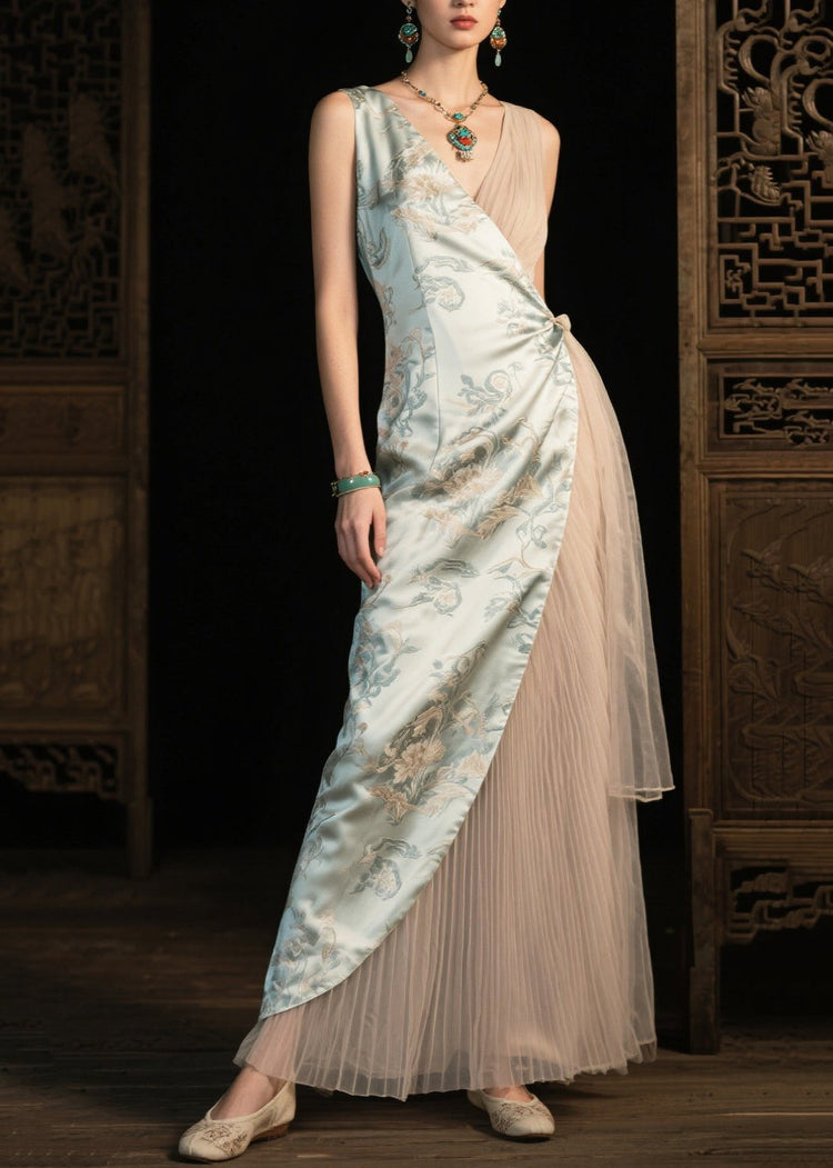 Women Light Green Asymmetrical Patchwork Silk Pleated Dresses Summer