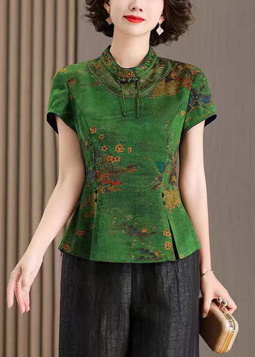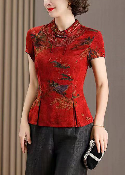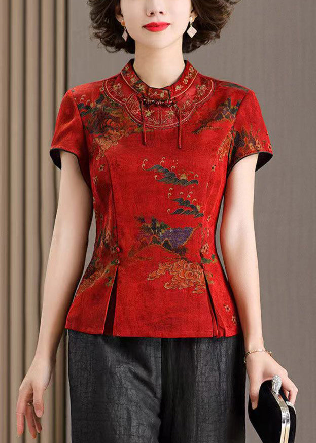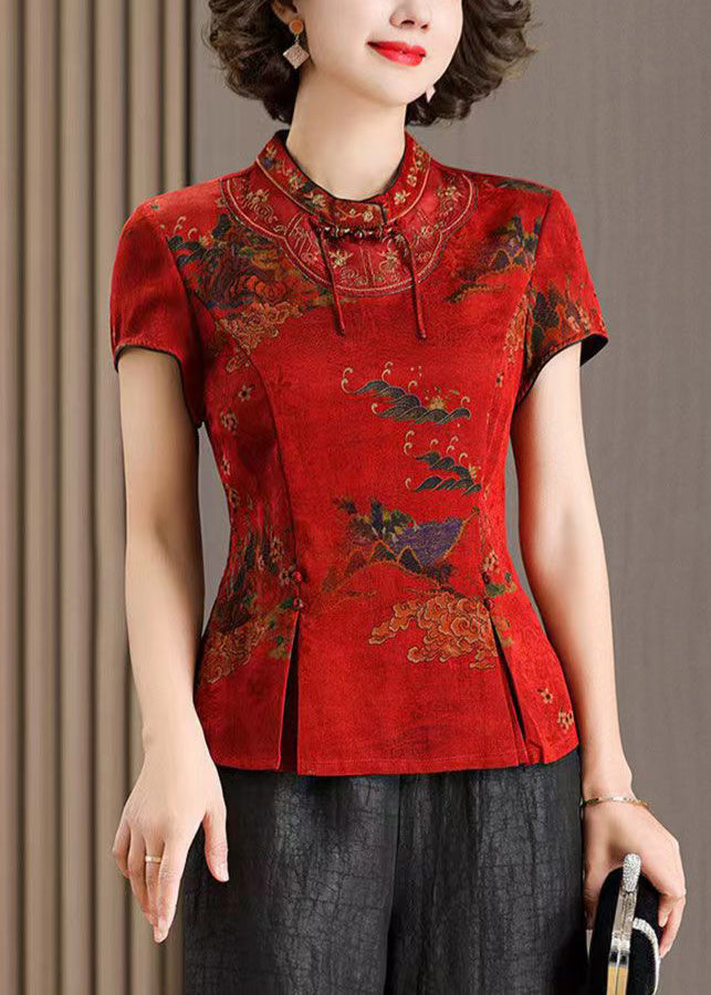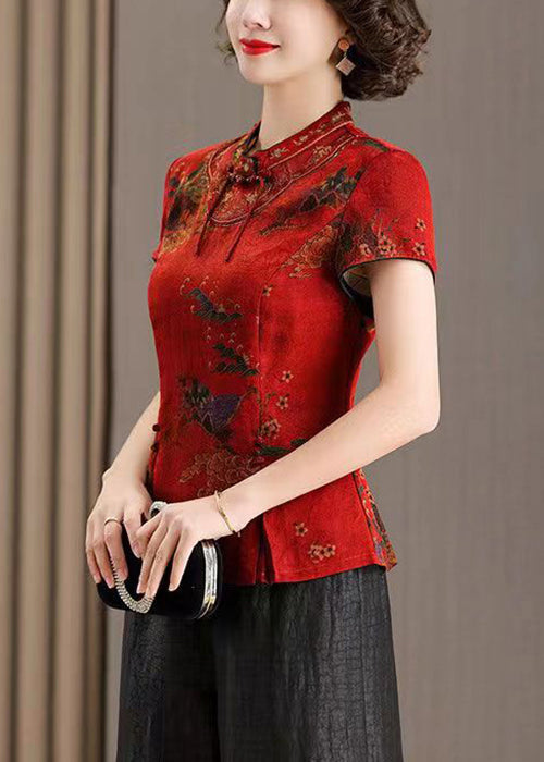 Women Red Stand Collar Print Side Cpen Silk T Shirt Summer