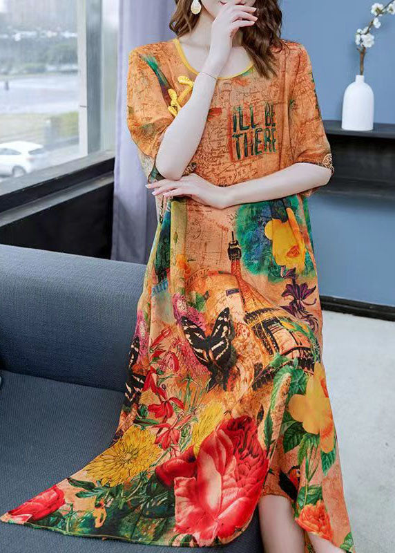 Women Yellow Print Chinese Button Patchwork Silk Dress Summer