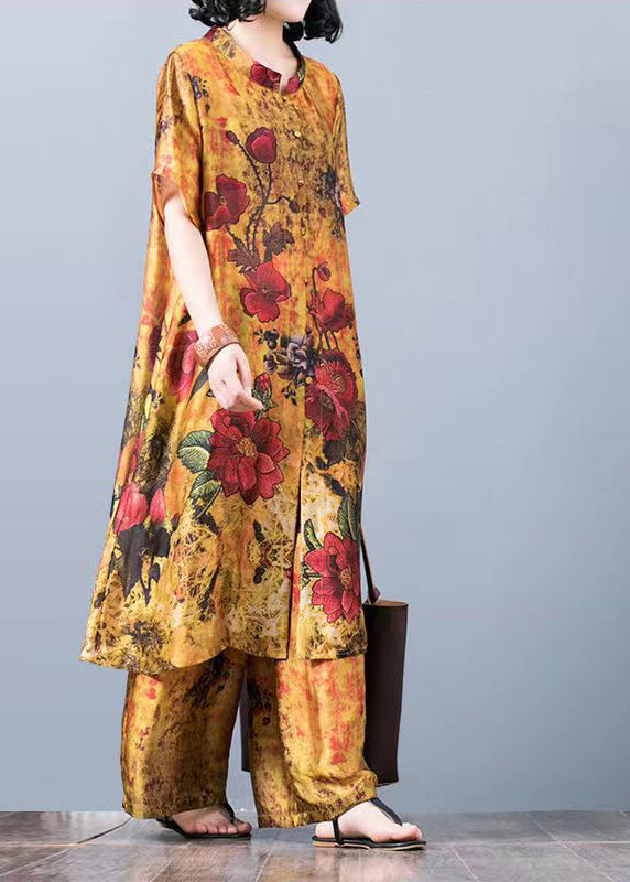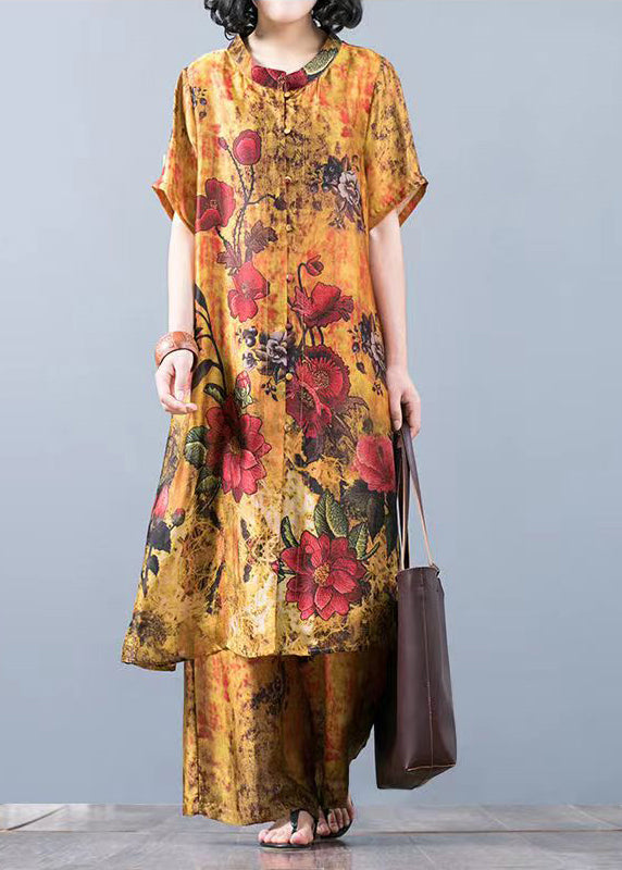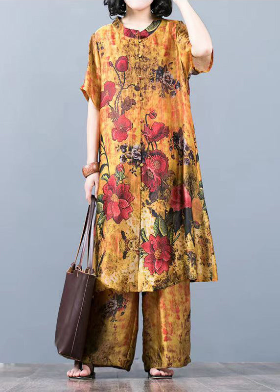 Yellow Floral Loose Silk Long Tops And Wide Leg Pants Two Pieces Set Short Sleeve