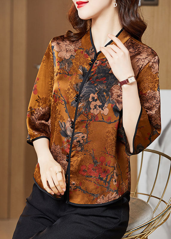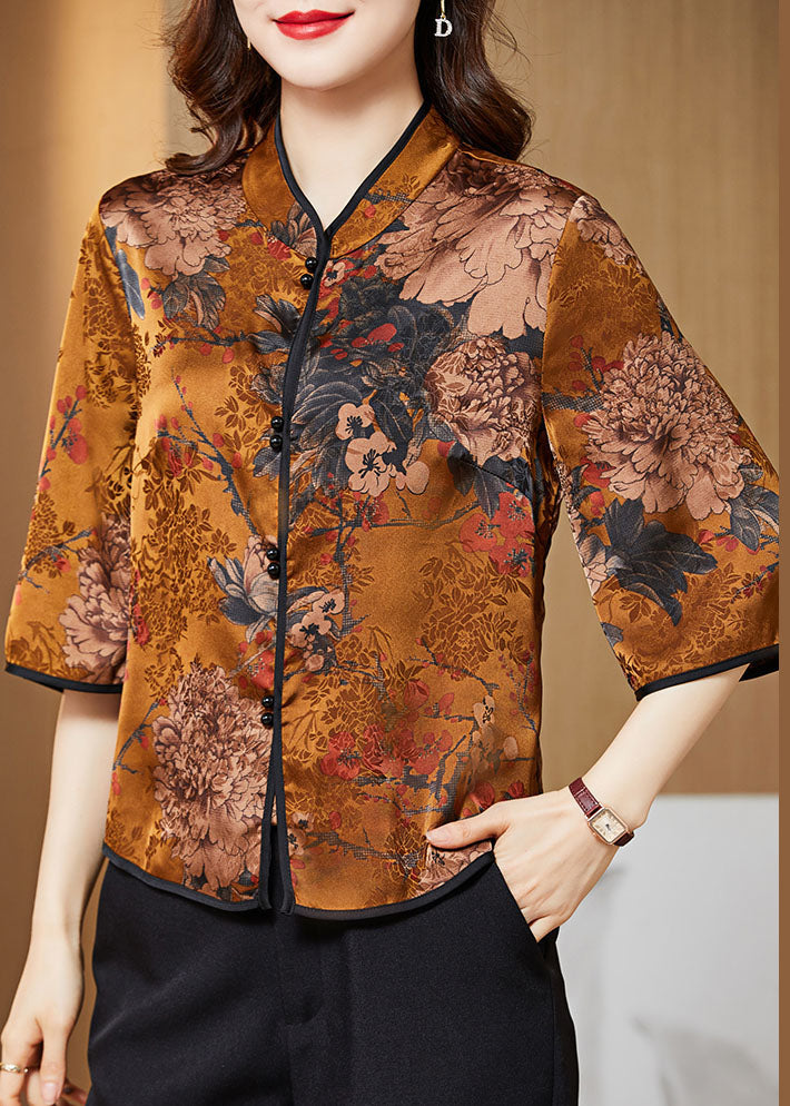 Yellow Print Silk Shirt Tops Stand Collar Button Half Sleeve
