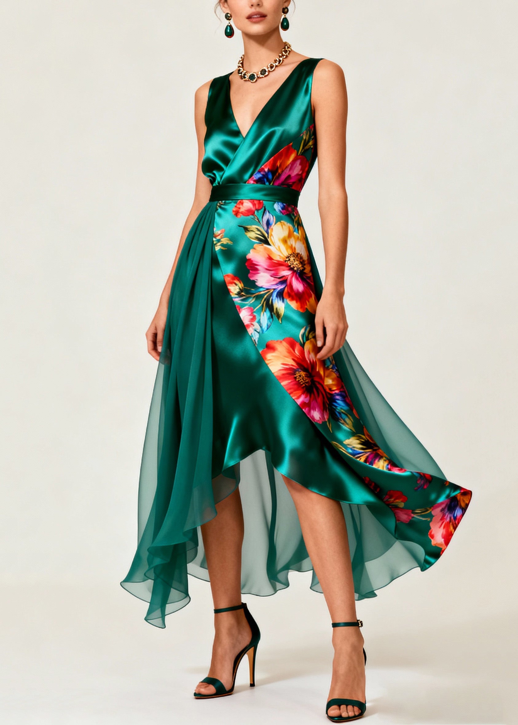 Boutique Green V Neck Print Patchwork Silk Dresses Sleeveless