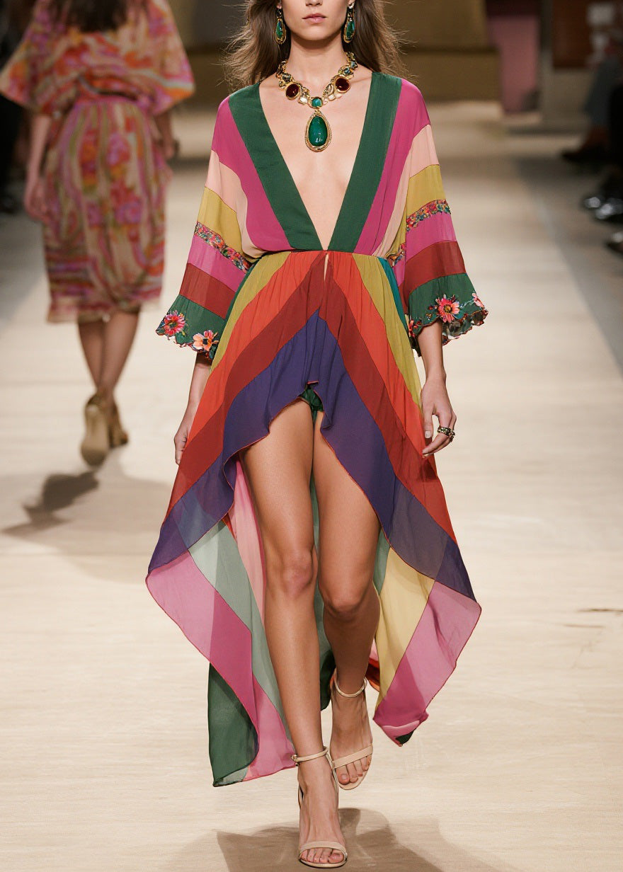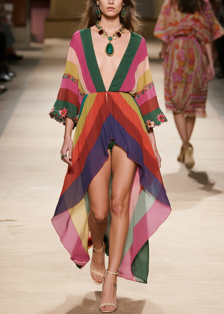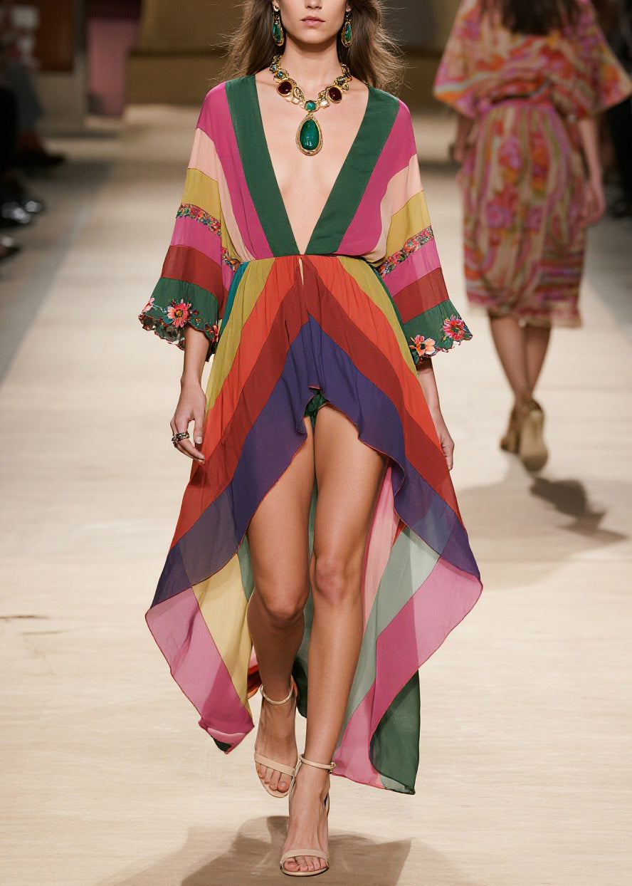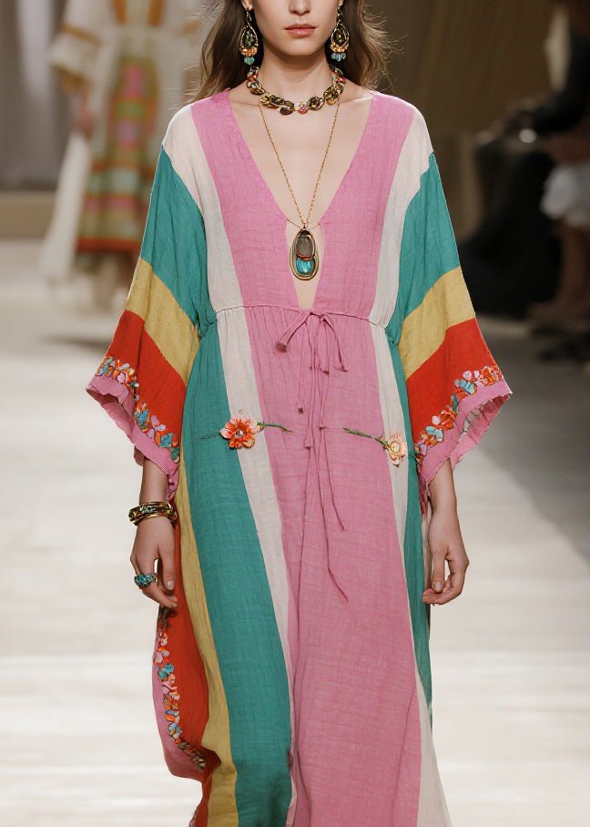 Beautiful Colorblock V Neck Patchwork Cotton Long Dresses Summer