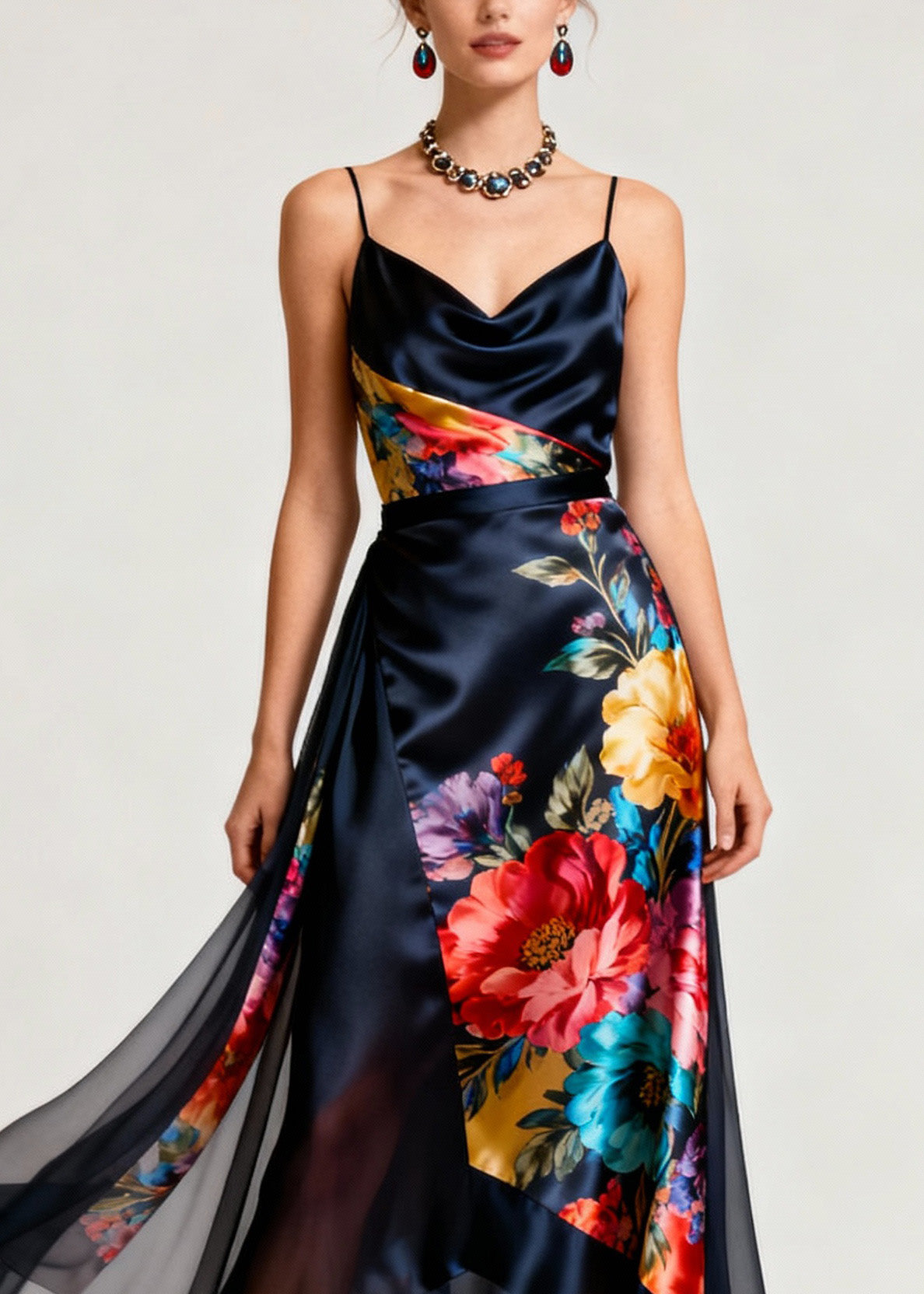 Women V Neck Print Tulle Patchwork Silk Dresses Sleeveless