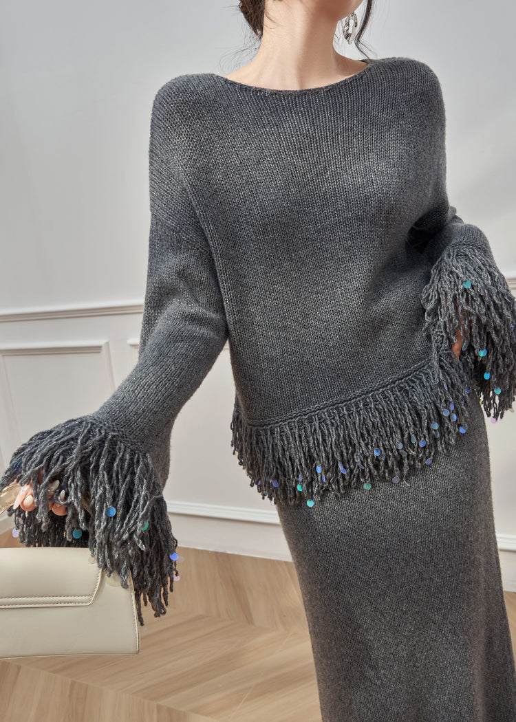 Loose Grey O Neck Tasseled Sweaters And Skirts Knit Two Pieces Set Flare Sleeve