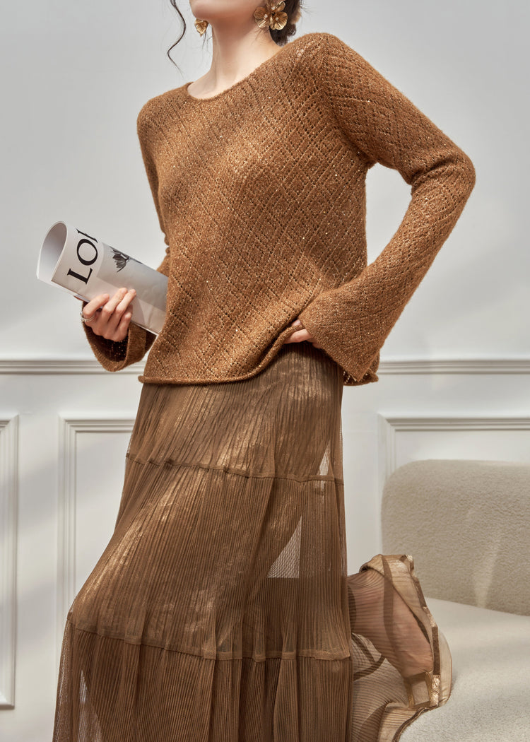 New Brown Hollow Out Knit Sweaters And Wrinkled Skirts Two Pieces Set Winter