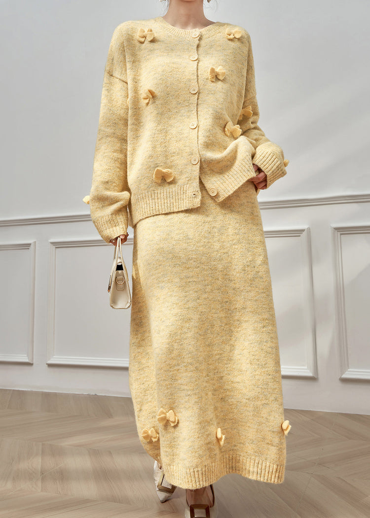 Plus Size Grey O Neck Bow Button Knit Two-Piece Set Winter