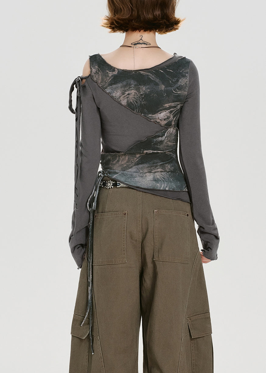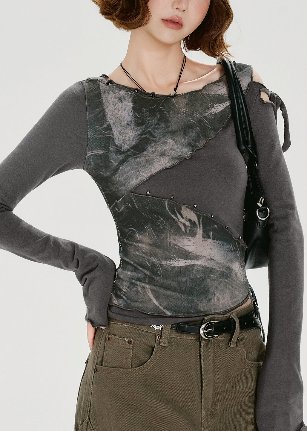 American Style Grey False Two Pieces Patchwork Cotton T Shirt Fall
