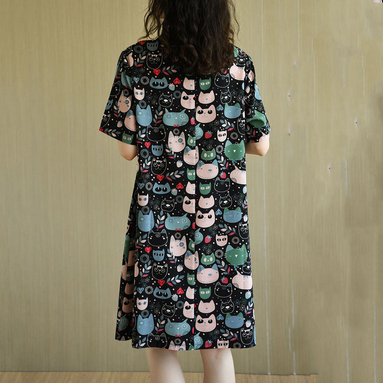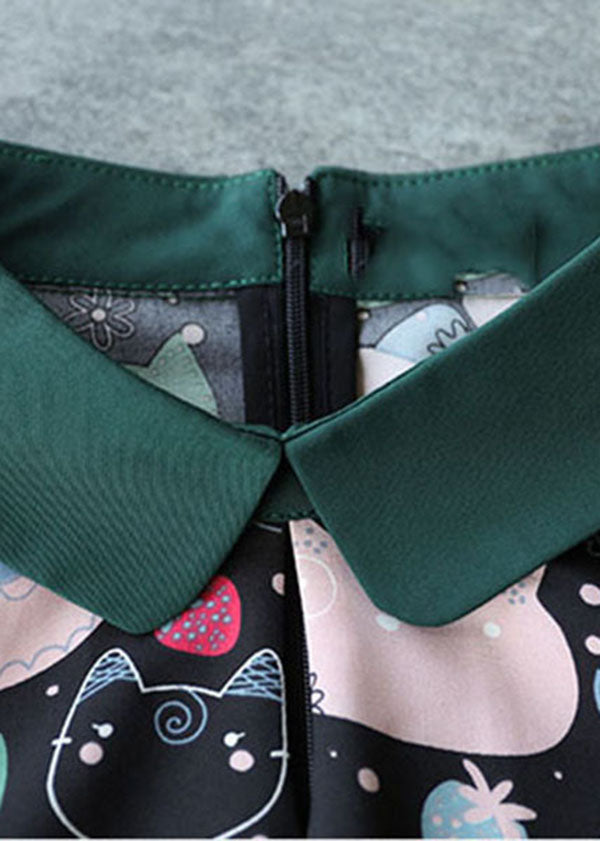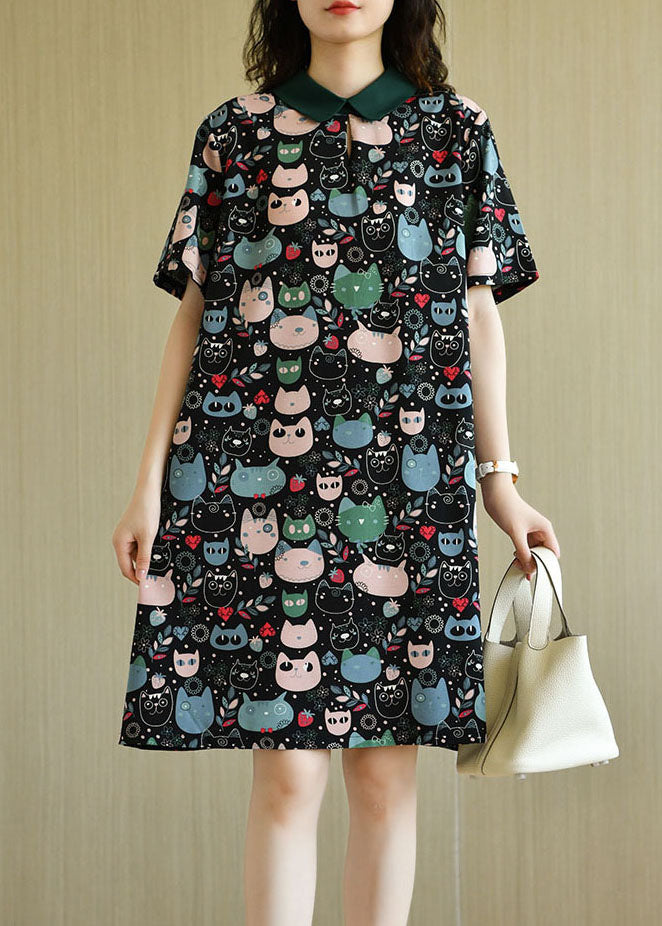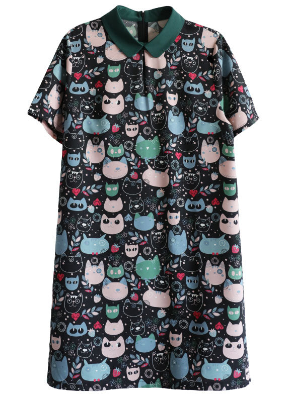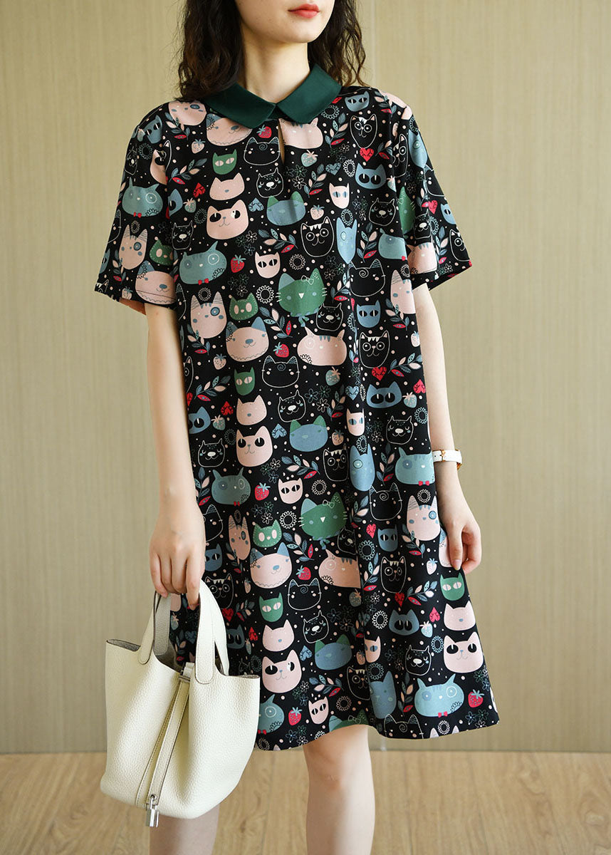 Diy Black Peter Pan Collar Zippered Cat Print Chiffon Mid Dress Short Sleeve
