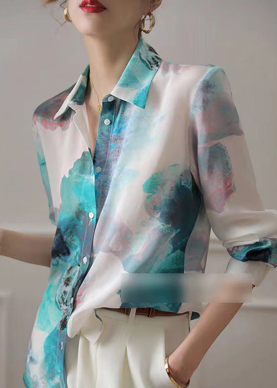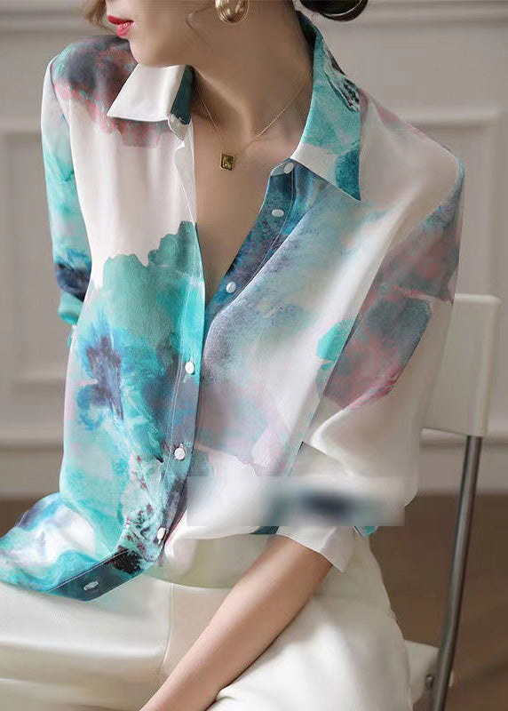 Gradient Color Peter Pan Collar Print Button Satin Shirt Long Sleeve