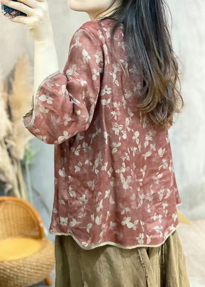 Loose Red O Neck Button Print Linen Blouse Bracelet Sleeve