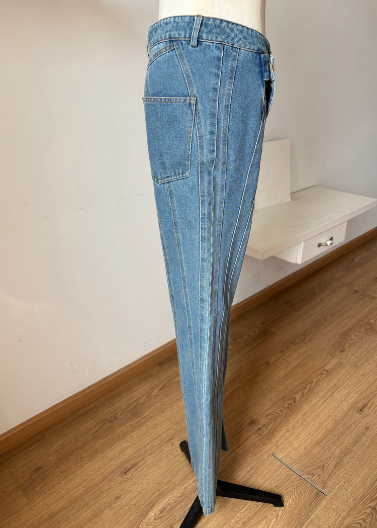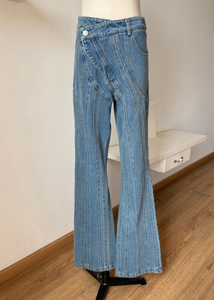 Fashion Blue Asymmetrical Design Pockets Denim Flared Trousers Fall