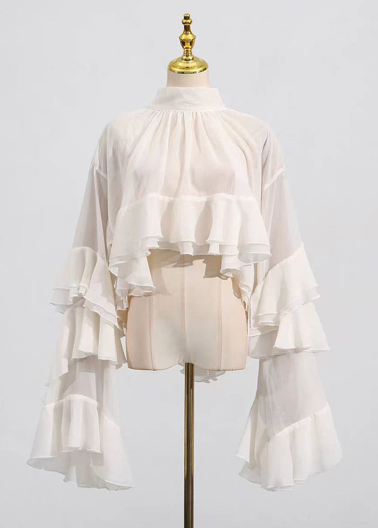 Women Beige Hign Neck Ruffled Patchwork Tulle Top Flare Sleeve