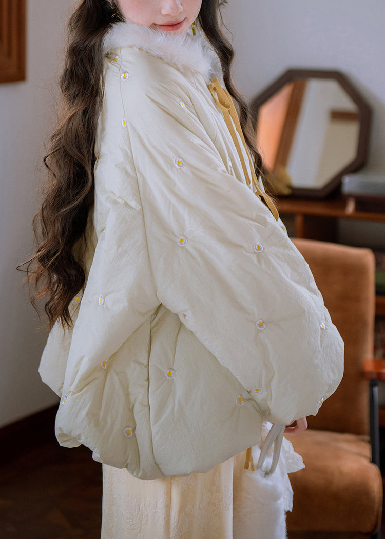 Loose Cream Yellow Fur Collar Embroidered Lace Up Cotton Filled Parkaer Winter