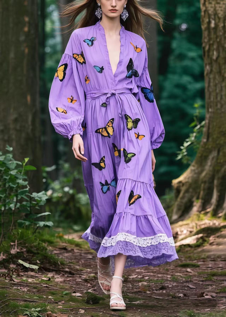 Beautiful Lavender Tie Waist Butterfly Cotton Vacation Dress Spring