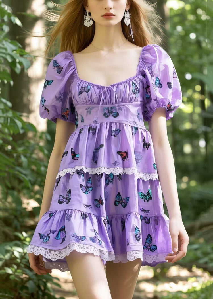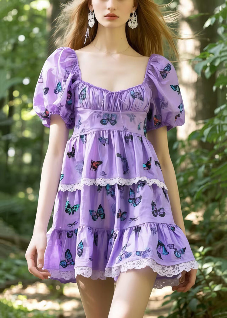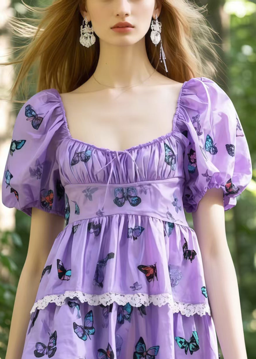 Elegant Lavender Square Collar Butterfly Cotton Tea Dress Puff Sleeve