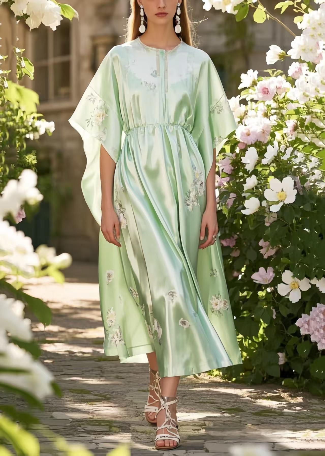 Classy Fruit Green Print Silk Holiday Dress Batwing Sleeve