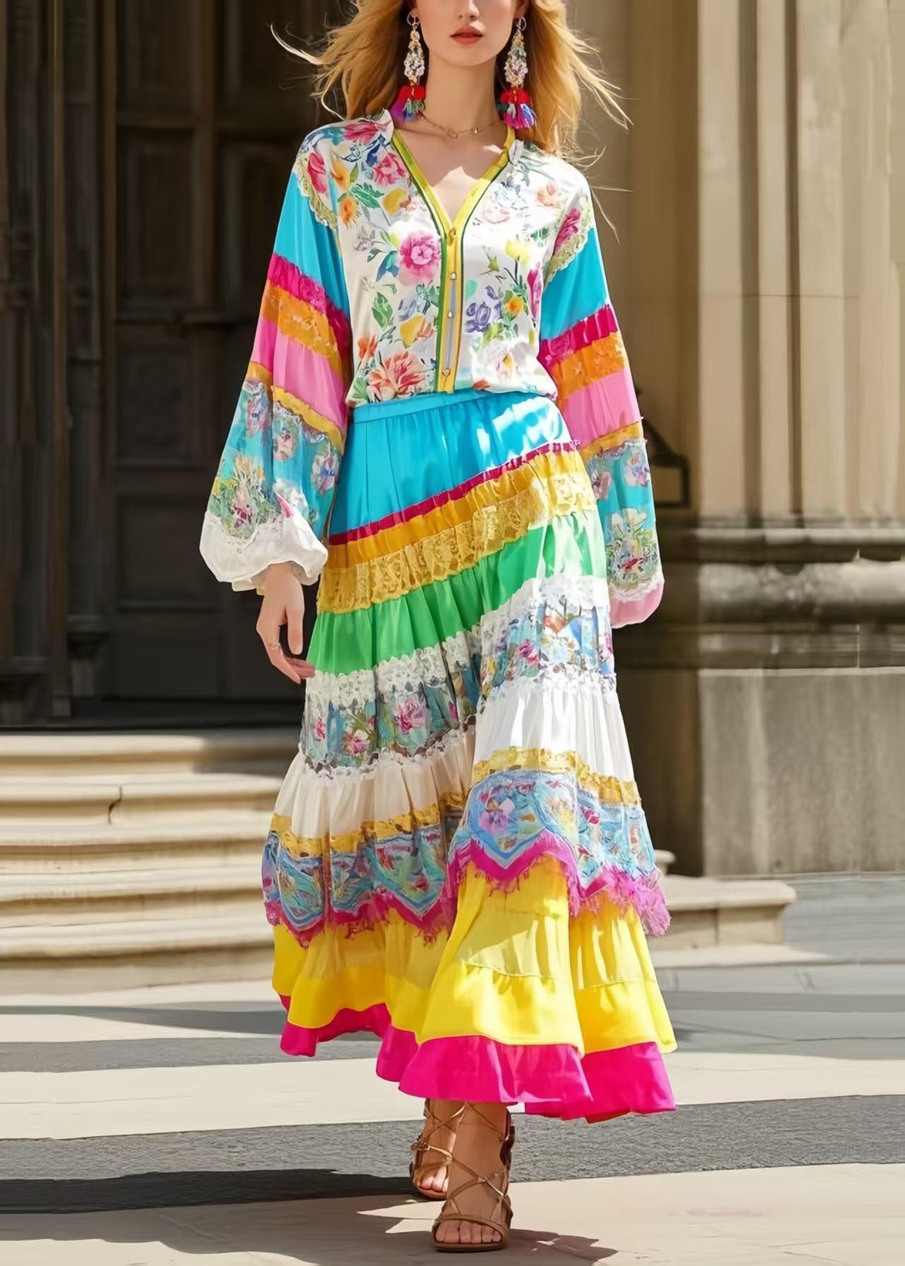 Beautiful Rainbow Tie Dye Patchwork Lace Silk Two Piece Suit Set Spring