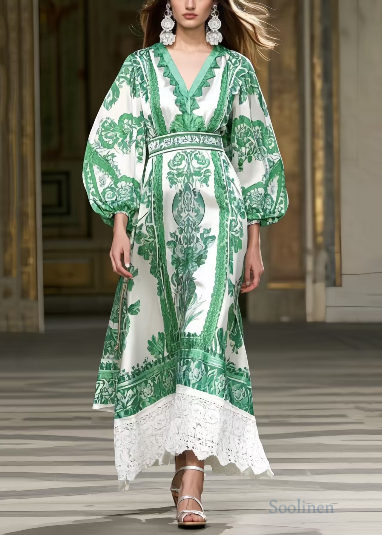 Vintage Green Puff Sleeve Patchwork Lace Robe Dresses Spring