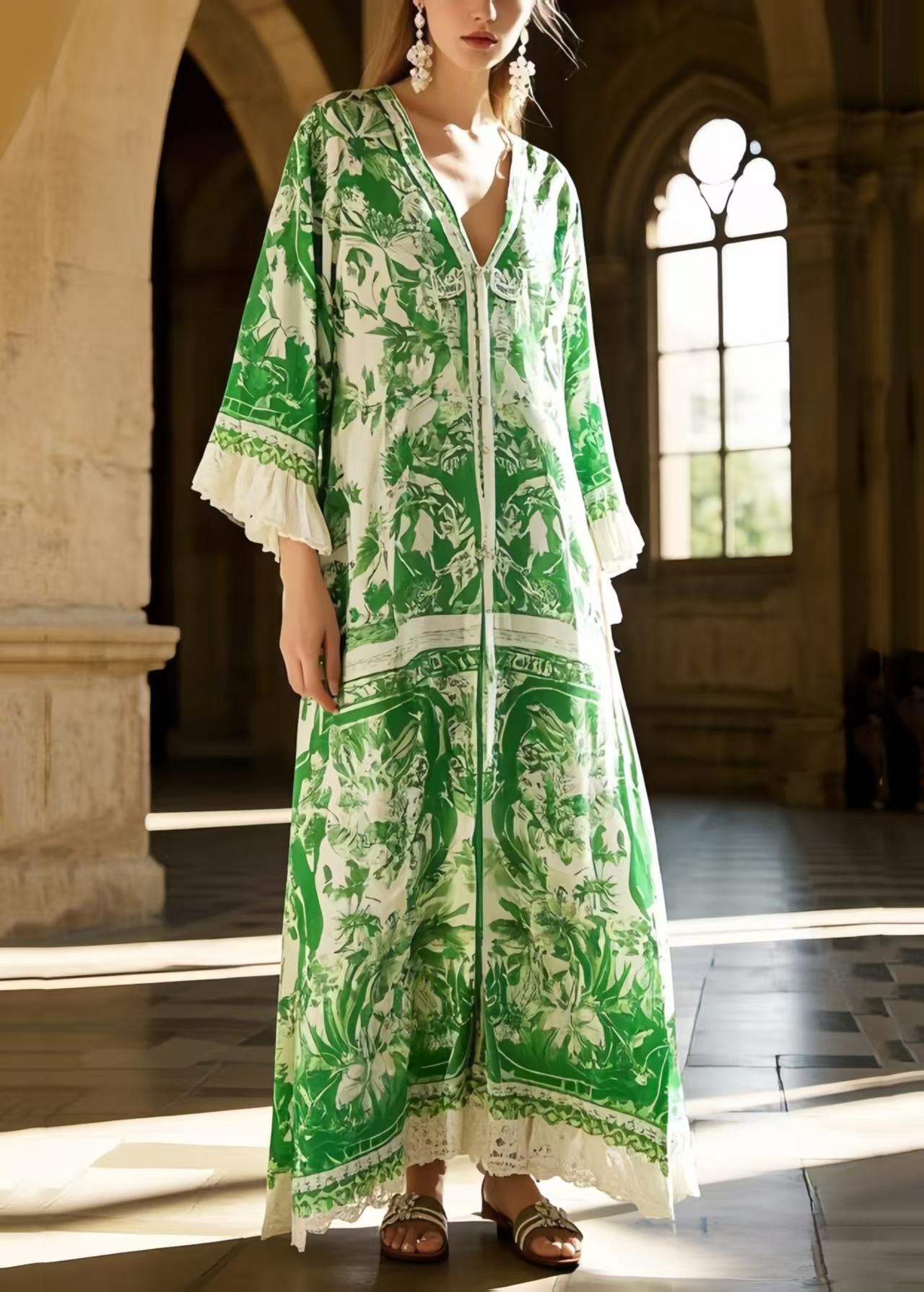 Fitted Green Print Wrinkled Silk Long Dresses Spring
