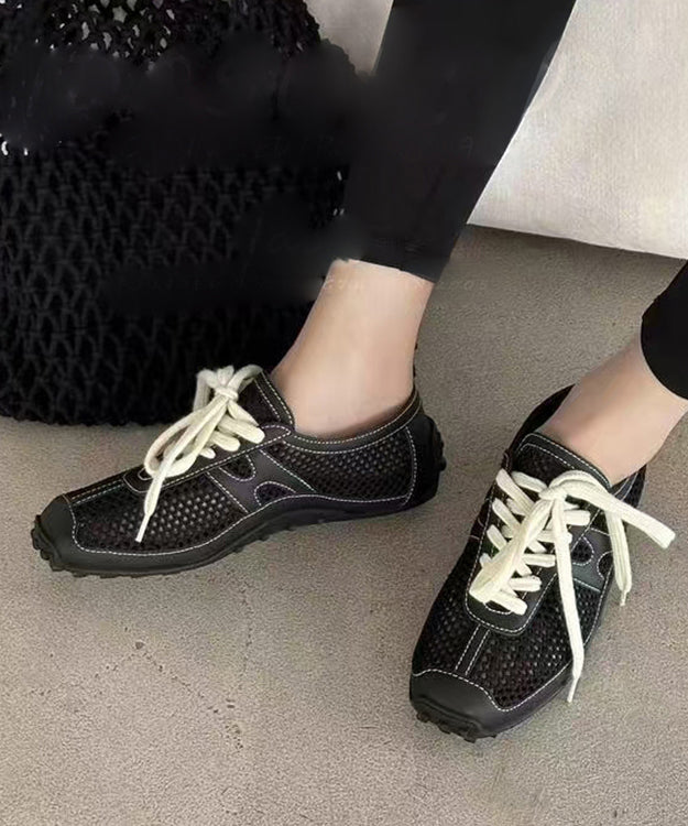 Black Breathable Mesh Splicing Cowhide Leather Flat Shoes